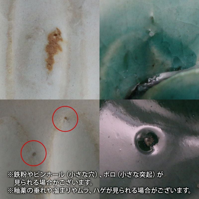 | 注意事項 | ※サイズは全て外寸になります。 ※サイズ・重さなどは商品により誤差があります。 ご注意 ※鉄粉やピンホール(小さな穴)、ボロ(小さな突起)が見られる場合がございます。 ※釉薬の垂れや溜まりやムラ、ハゲが見られる場合がございます。 ※貫入青釉はヒビを装飾に用いた「貫入」が表面に入っております。 ※お客様のお使いのモニター設定、お部屋の照明等により実際の商品と色味が異なって見える場合がございます。 ※画像に含まれる小物は使用イメージのために使用しています。 ※不明な点がございましたら、お気軽にお問い合わせ下さい。 |