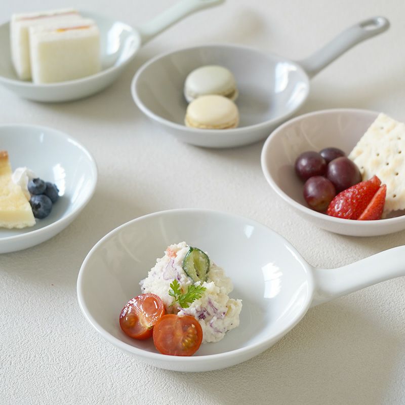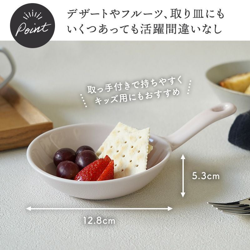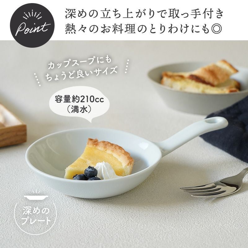 フライパン型のおしゃれなプレートです。 こちらのサイズは副菜や焼き菓子、フルーツなどをちょっこと盛りつけたいときに便利な大きさ。 ティータイムにも最適です。 シリーズでサイズ違いのプレートと合わせれば、統一感のあるカフェ風おうちごはんが気軽に演出できますよ。