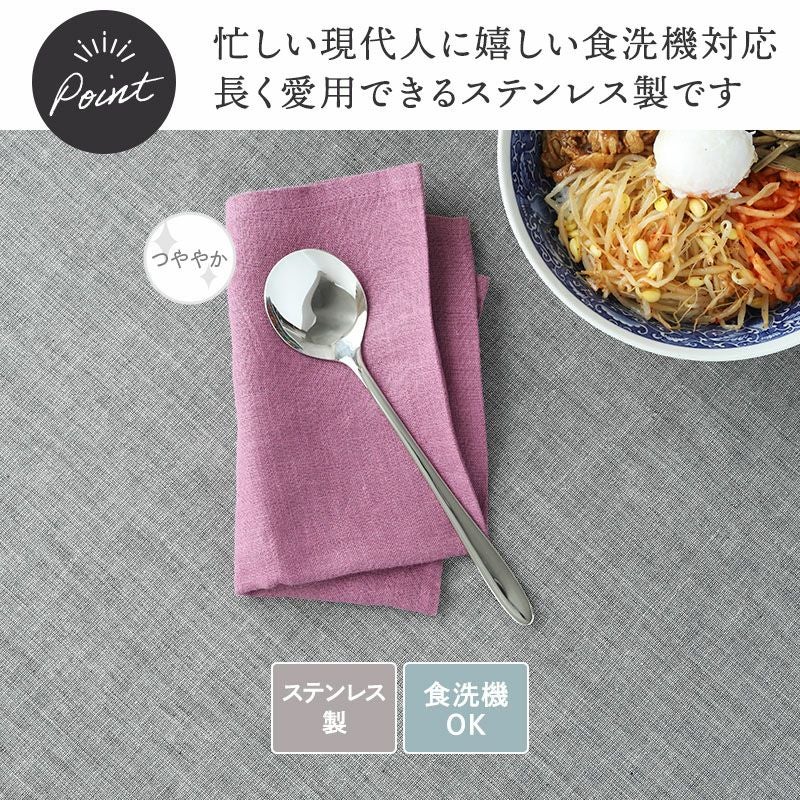 スタイリッシュなステンレス製のビビンバスプーン。 無駄のないデザインでシンプル&高級感のあるカトラリーは、テーブルコーディネートをワンランクアップさせてくれます。 こちらのスプーンは、柄が長く、すくう部分が平たいタイプ。石焼ビビンバやスープなどの温かいお料理にぴったりです。 普段使いからおもてなしまで大活躍間違いなしです。同シリーズとの合わせ使いもおすすめ。