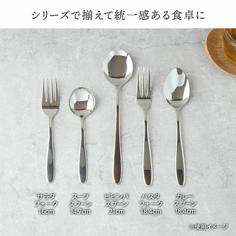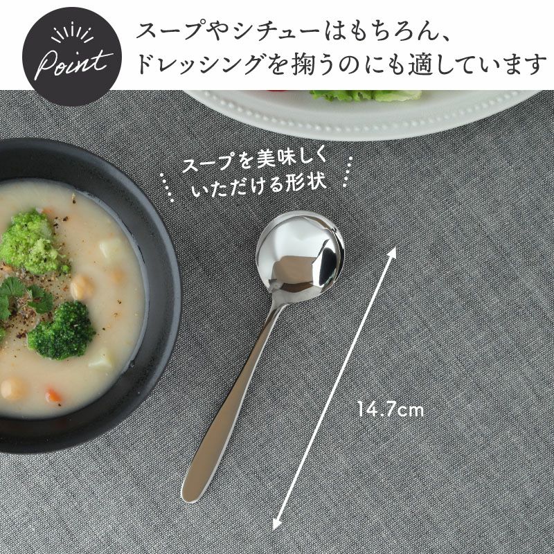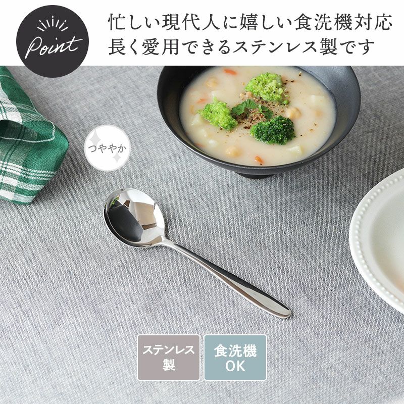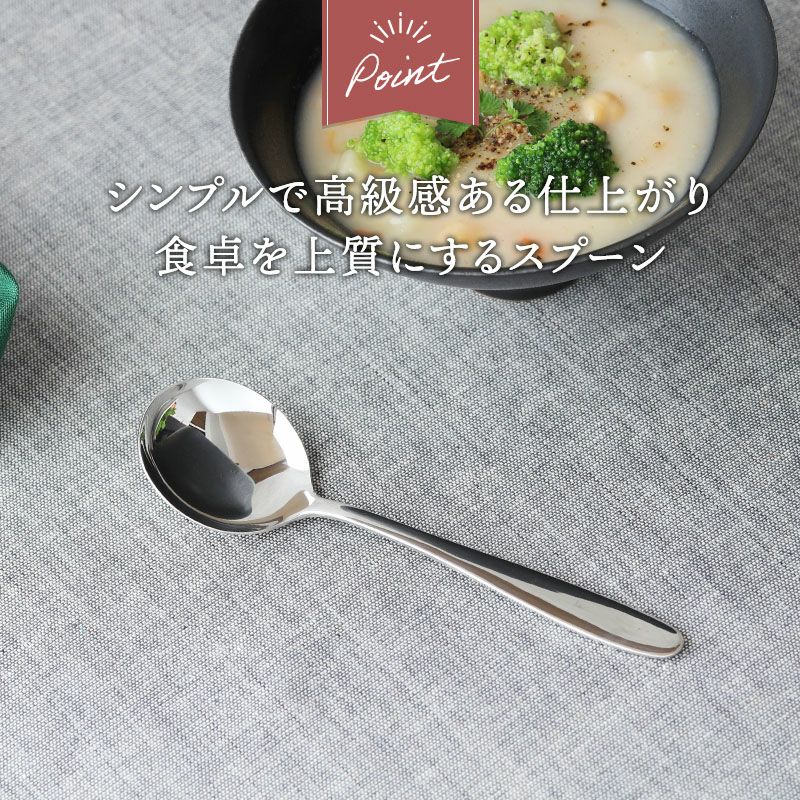 スタイリッシュなステンレス製のスープスプーン。 無駄のないデザインでシンプル&高級感のあるカトラリーは、テーブルコーディネートをワンランクアップさせてくれます。 大きすぎず小さすぎないサイズで使いやすい、こちらのスープスプーンは、ヨーグルトスプーンやアイスクリームスプーン、軽量で手に馴染むデザインなのでお子さま用にもお使いいただけます。 普段使いからおもてなしまで大活躍間違いなしです。同シリーズとの合わせ使いもおすすめ。