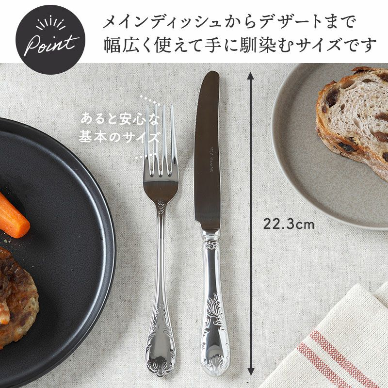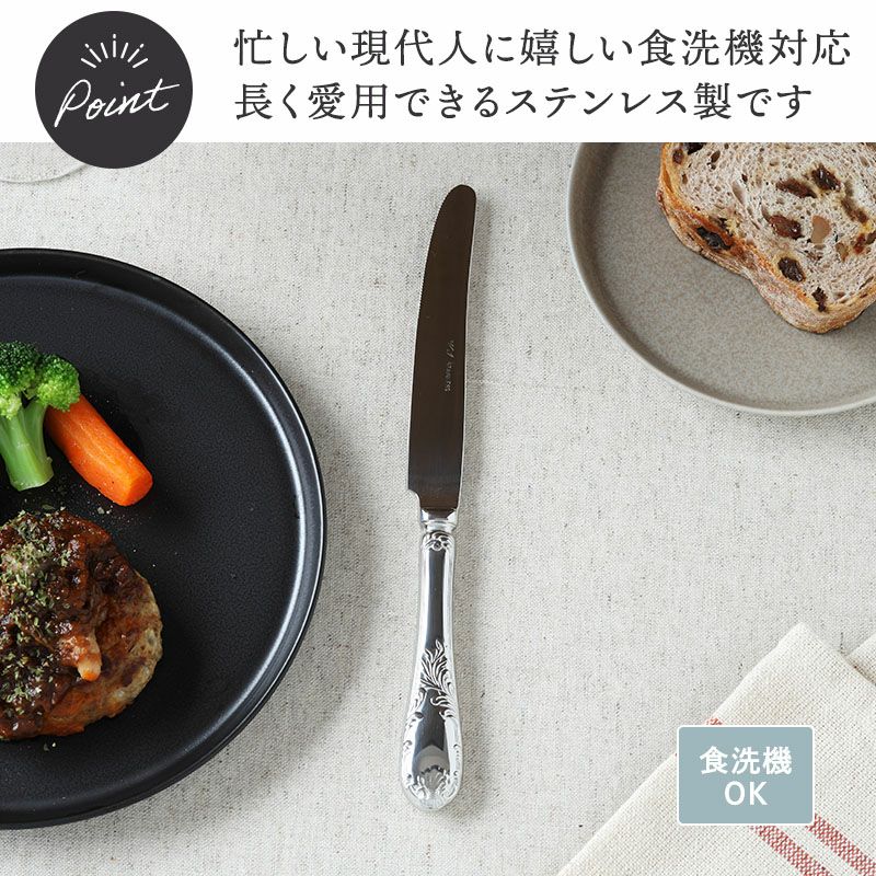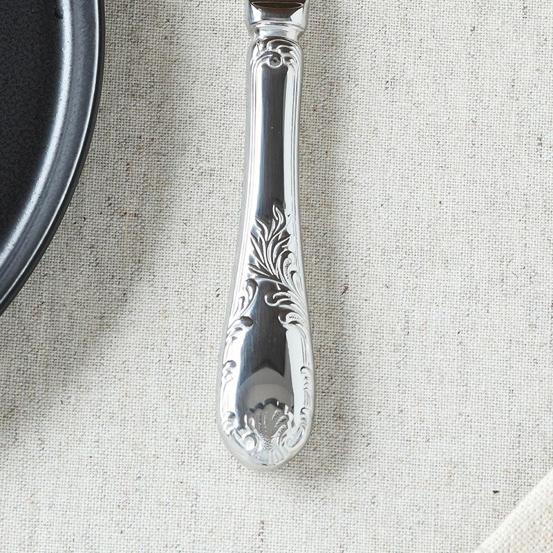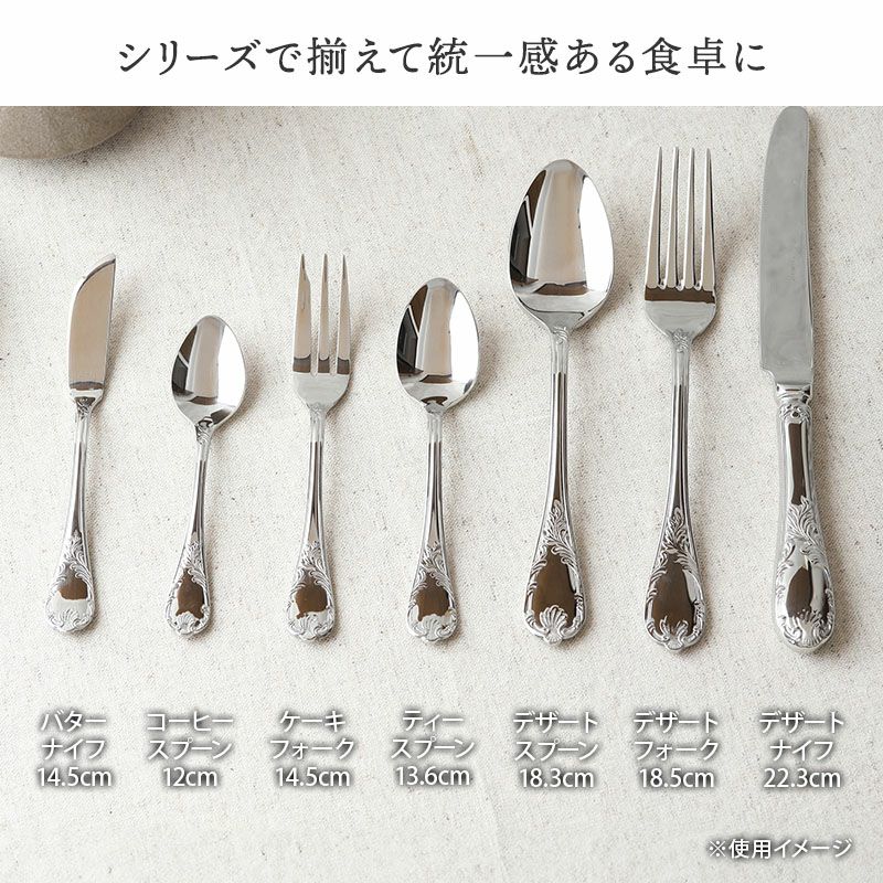クラシカルなデザインと味わい深いシルバーの色合いがおしゃれなデザートナイフ。 すっきりとしたデザインなので、様々なシーンに合わせることが出来ますよ。 こちらのナイフはデザートをはじめ、オードブル、メイン料理まで幅広くお使いいただけます。 ティータイムからお食事まで幅広いシーンでお使いいただけます。テーブルをワンランクアップするのに欠かせないアイテムです。