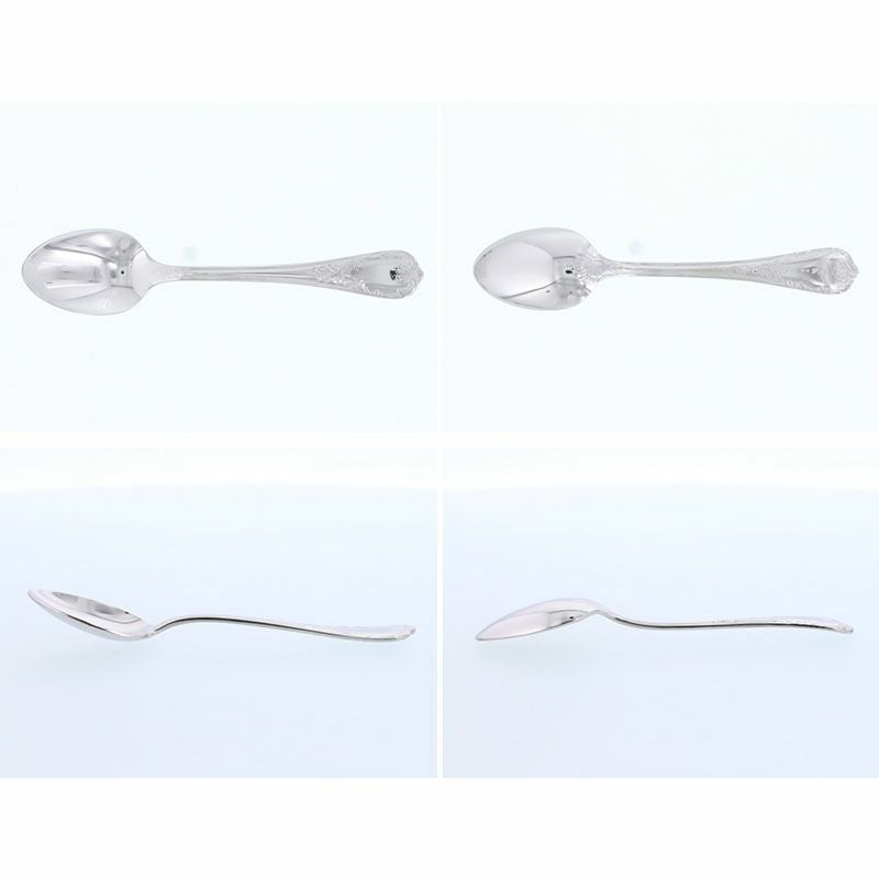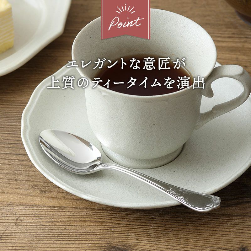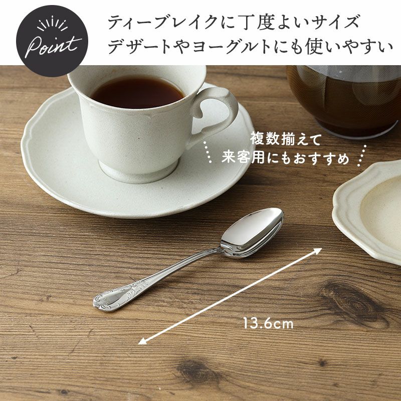 クラシカルなデザインと味わい深いシルバーの色合いがおしゃれなティースプーン。 すっきりとしたデザインはシーンを選ばずお使いいただけます。 こちらは小さめのスプーンでティータイムのコーヒー、紅茶用にはもちろん、アイスクリーム、ヨーグルトのスプーンとしてもおすすめ お茶の時間からお食事まで幅広いシーンでお使いいただけます。テーブルをワンランクアップするのに欠かせないアイテムです。