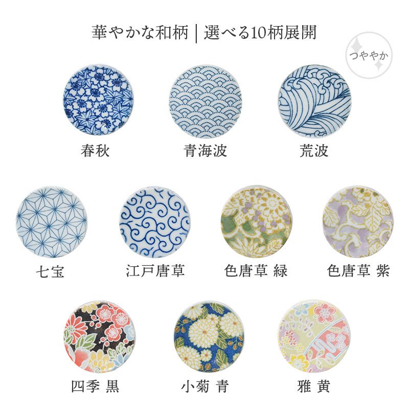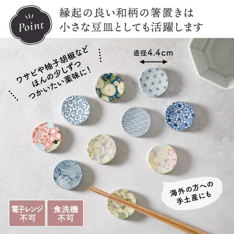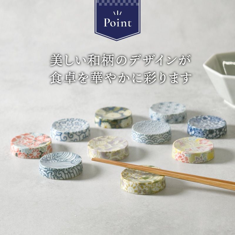 美しく縁起の良い和柄を楽しめる箸置きです。 お気に入りの柄を揃える、別柄を組み合わせて使ったりなどどんな組み合わせでも華やかに彩ってくれます。 箸置きの他に、小さな豆皿としてもお使いいただけます。 普段使いからおもてなし用、お祝い事用食器まで様々なシーンでお使いいただけます。