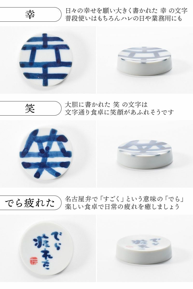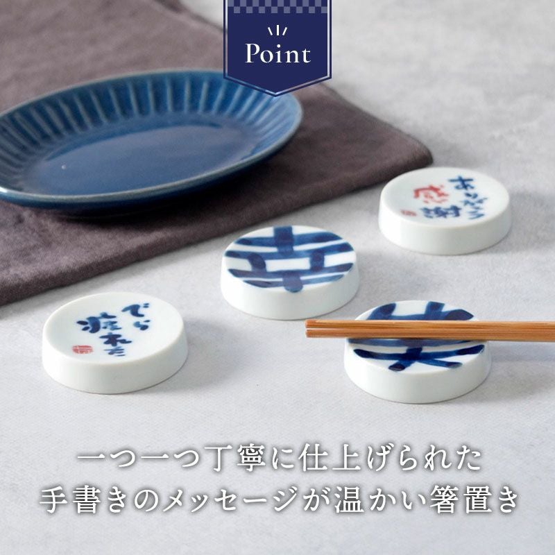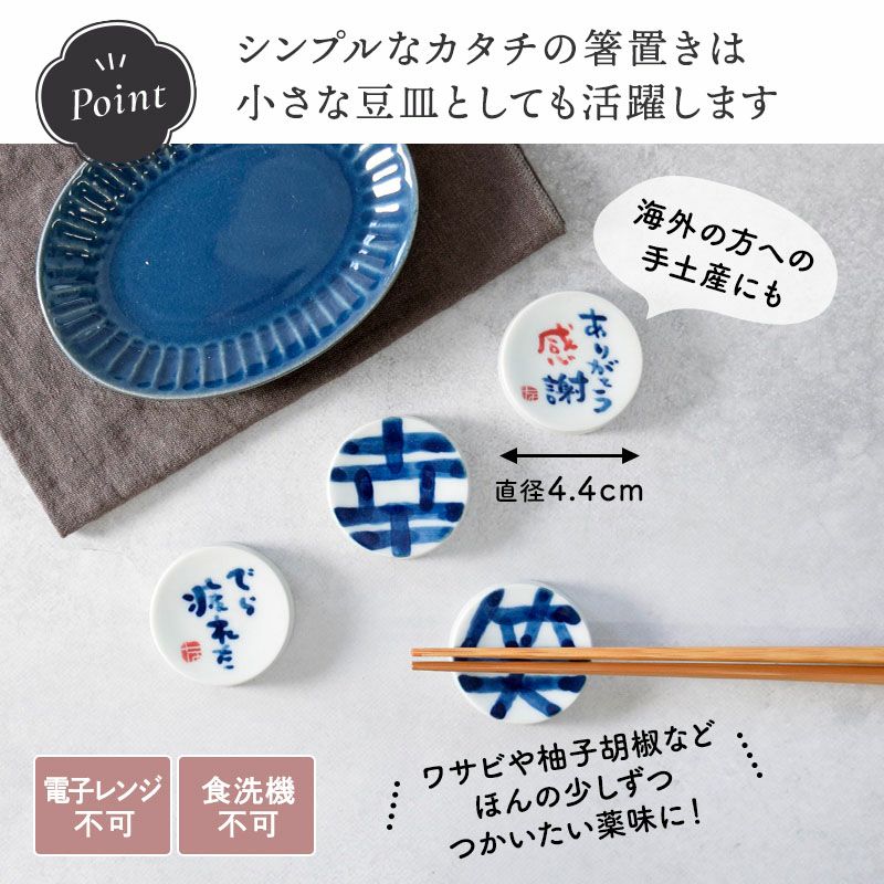 あたたかみある手描き文字が印象的な箸置き。 全部で4種類の絵柄は、どれも食卓を賑やかに彩ります。 どんな食卓にも合わせやすいカラーリングがアクセントに。 普段使いはもちろん、来客用としてもお使いいただけます。