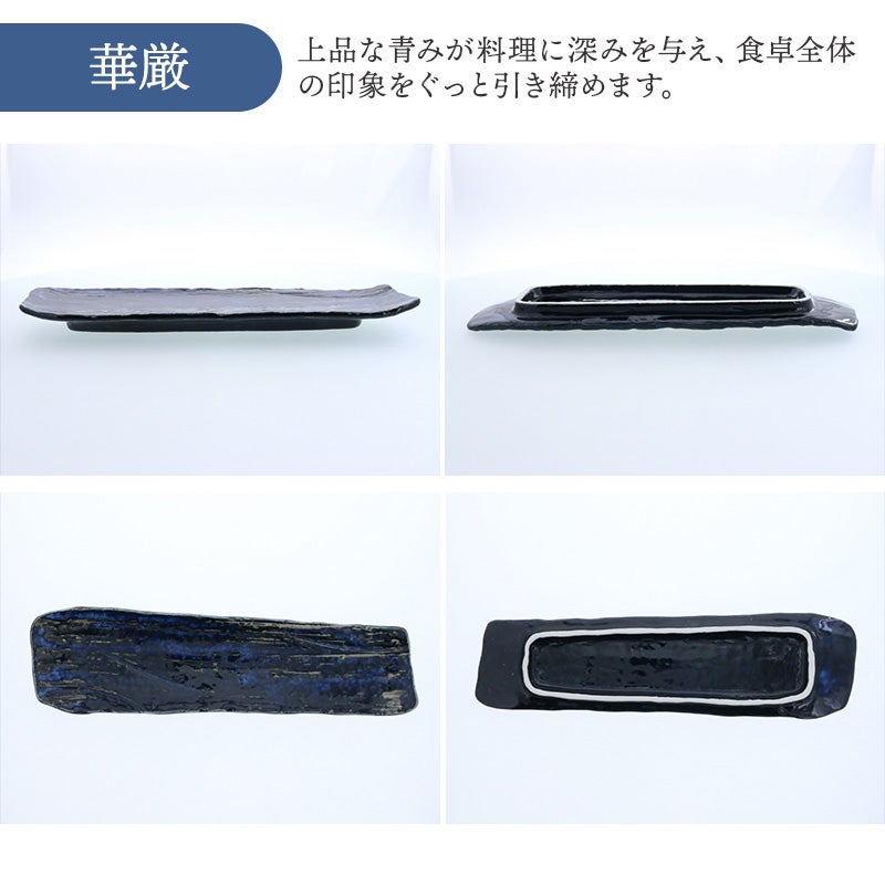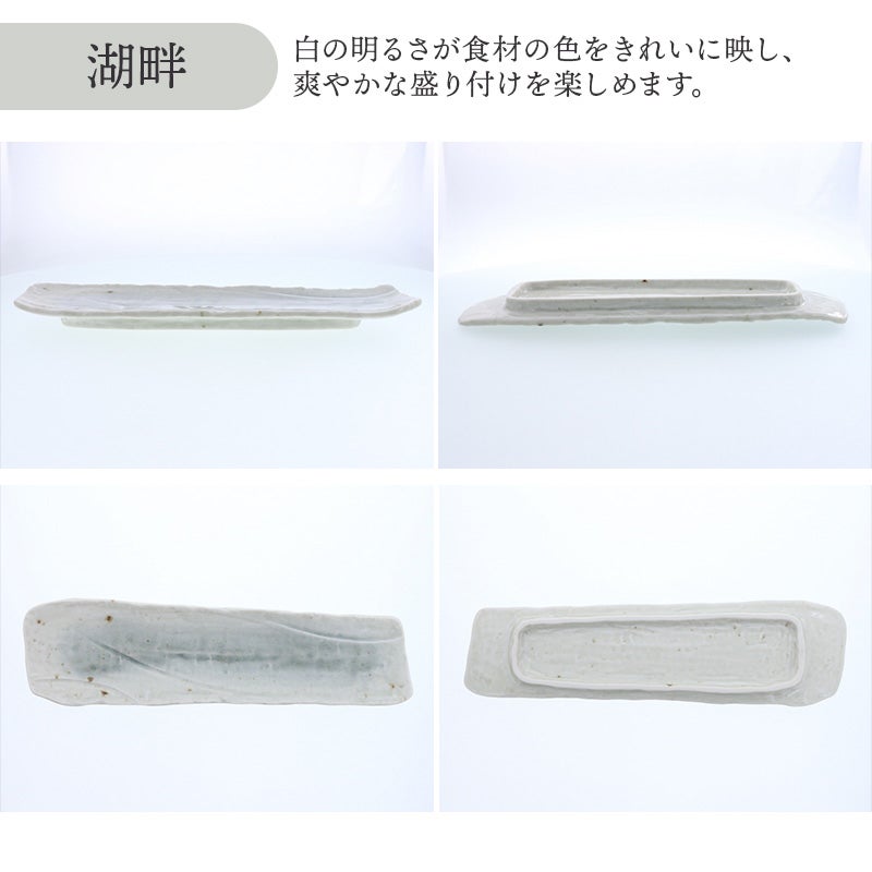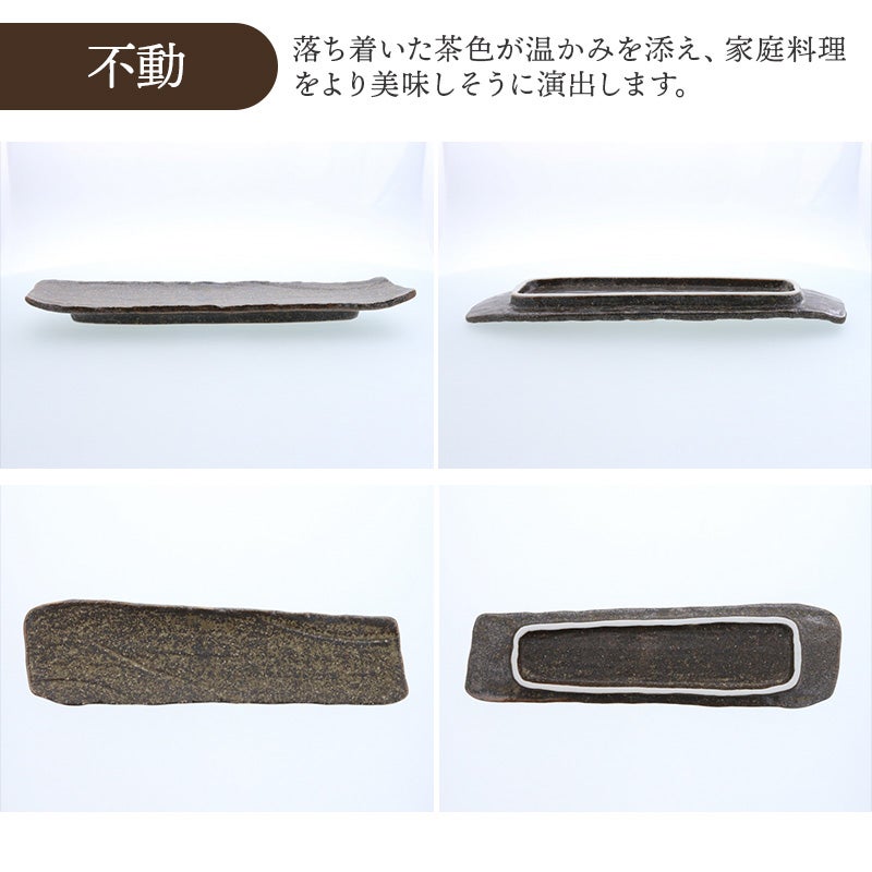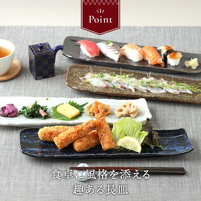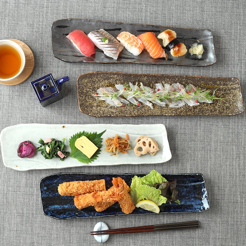 力強いフォルムと、趣ある釉薬の表情が魅力の松風シリーズの長皿。 約35cmの長さで、一尾まるごとのサンマもすっぽり収まります。 焼き魚皿としてはもちろん、お寿司やお刺身、焼き鳥などの串焼き、揚げ物の盛り皿、副菜皿などに大活躍。 和食はもちろん、洋食やエスニック料理にもマッチし、日常使いにもおもてなしにも活躍します。