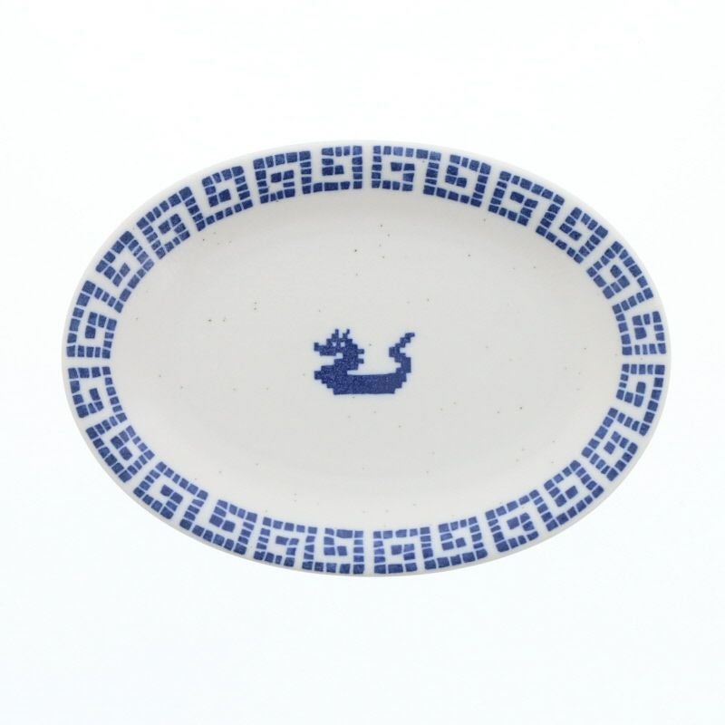 ドット絵風の龍と雷紋がユニークなアクセント、中華風の楕円皿。 19.5cmの程よいサイズで、副菜や前菜、スイーツの盛り付けにぴったり。 リム付きのやや深さのある形状で、タレやソースのある料理もこぼれにくい。 レトロ感と遊び心を備えたデザインで、日常の食卓を楽しく彩ります。