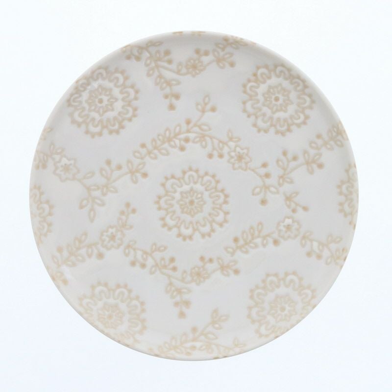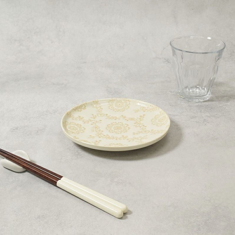 優しい色味とレースの柄が食卓をほっこりとさせる中皿。 直径15.3cmの中皿サイズは、取り皿、おかず皿、デザート皿にちょうど良いサイズ。 お食事では前菜や副菜のお皿として、ティータイムにはケーキ皿としても最適。 同シリーズで揃えて統一感のある食卓にするのもおすすめです。