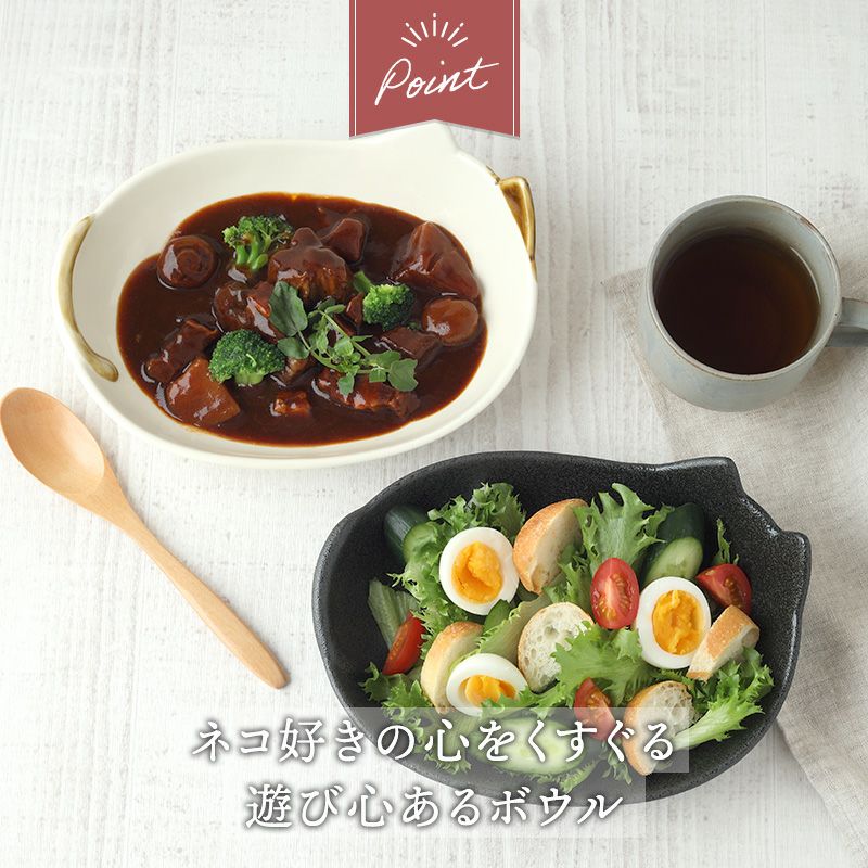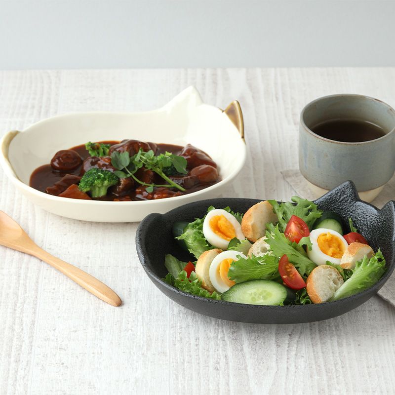 ほっこりかわいい猫型ボウルです。 取り皿として使ったり、副菜や一人分のおかずの盛り付けなどに便利なサイズ。 食卓のアクセントになる形状なので、毎日の食事も楽しくなります。 おもてなし食器としても活躍しますよ。