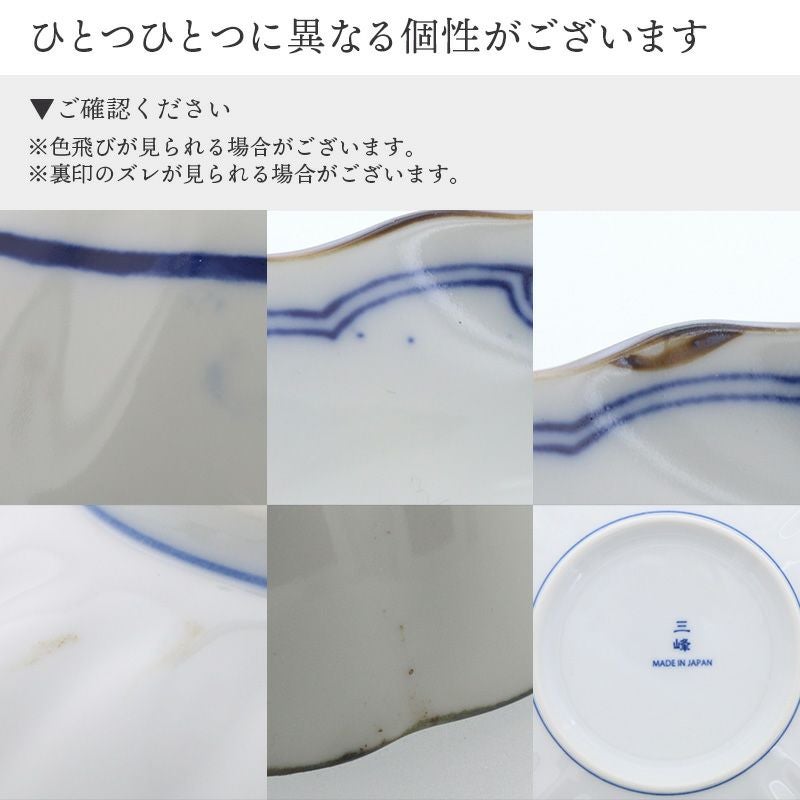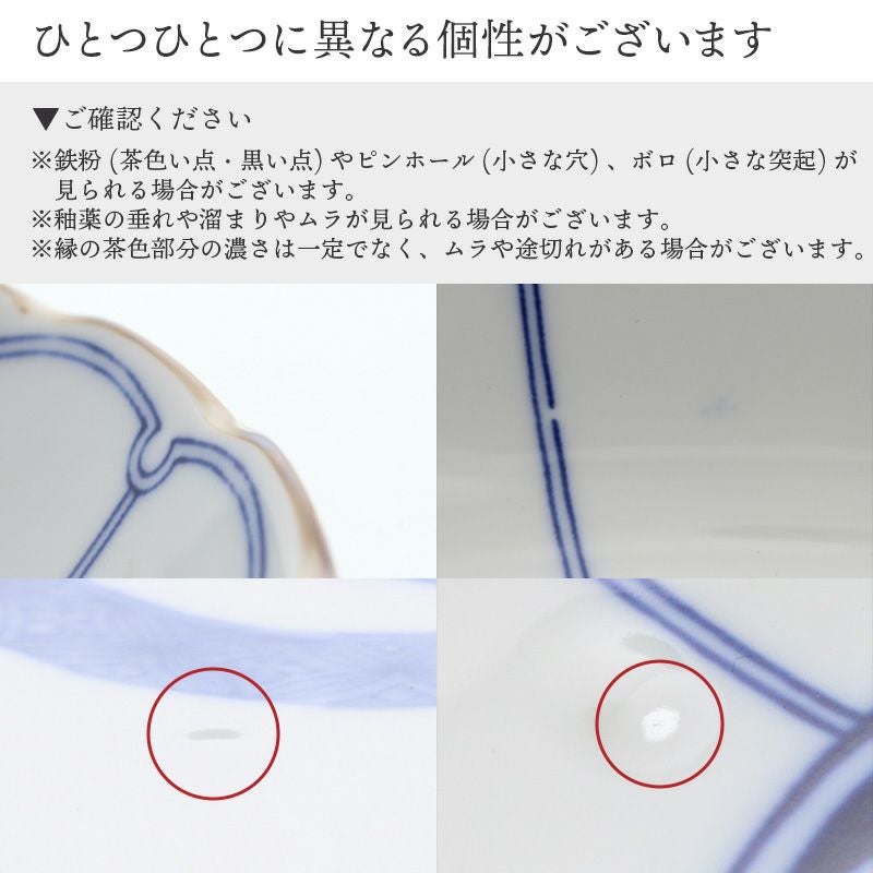 | 注意事項 | ※サイズは全て外寸になります。 ※サイズ・重さなどは商品により誤差があります。 ご注意 ※鉄粉(茶色い点・黒い点)やピンホール(小さな穴)、ボロ(小さな突起)が見られる場合がございます。 ※釉薬の垂れや溜まりやムラが見られる場合がございます。 ※色飛びが見られる場合がございます。 ※縁の茶色部分の濃さは一定でなく、ムラや途切れがある場合がございます。 ※裏印のズレが見られる場合がございます。 ※お客様のお使いのモニター設定、お部屋の照明等により実際の商品と色味が異なって見える場合がございます。 ※画像に含まれる小物は使用イメージのために使用しています。 ※不明な点がございましたら、お気軽にお問い合わせ下さい。 |