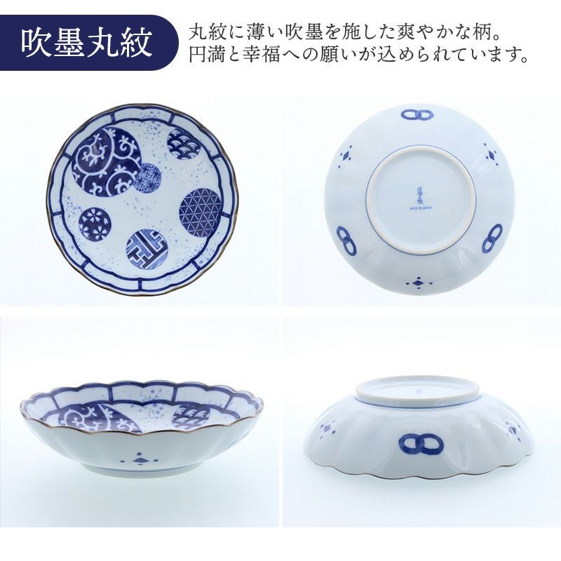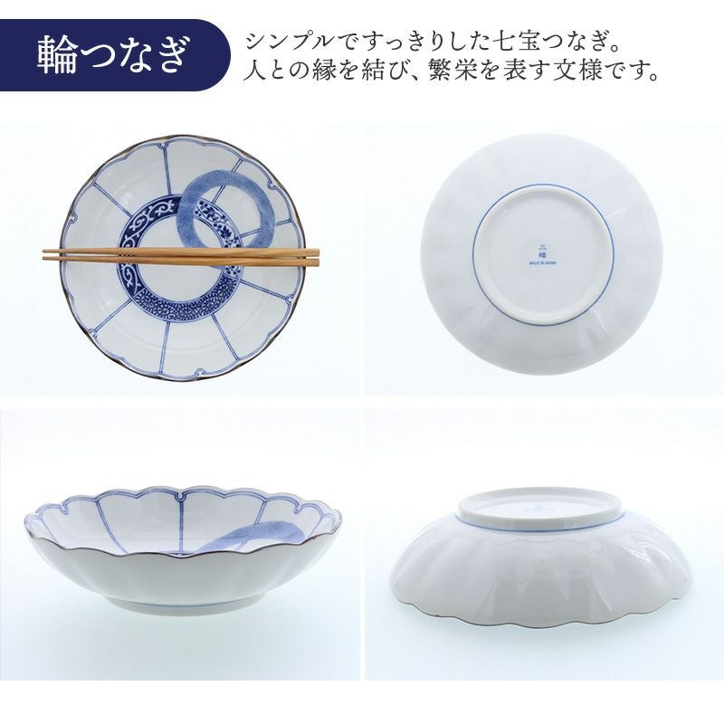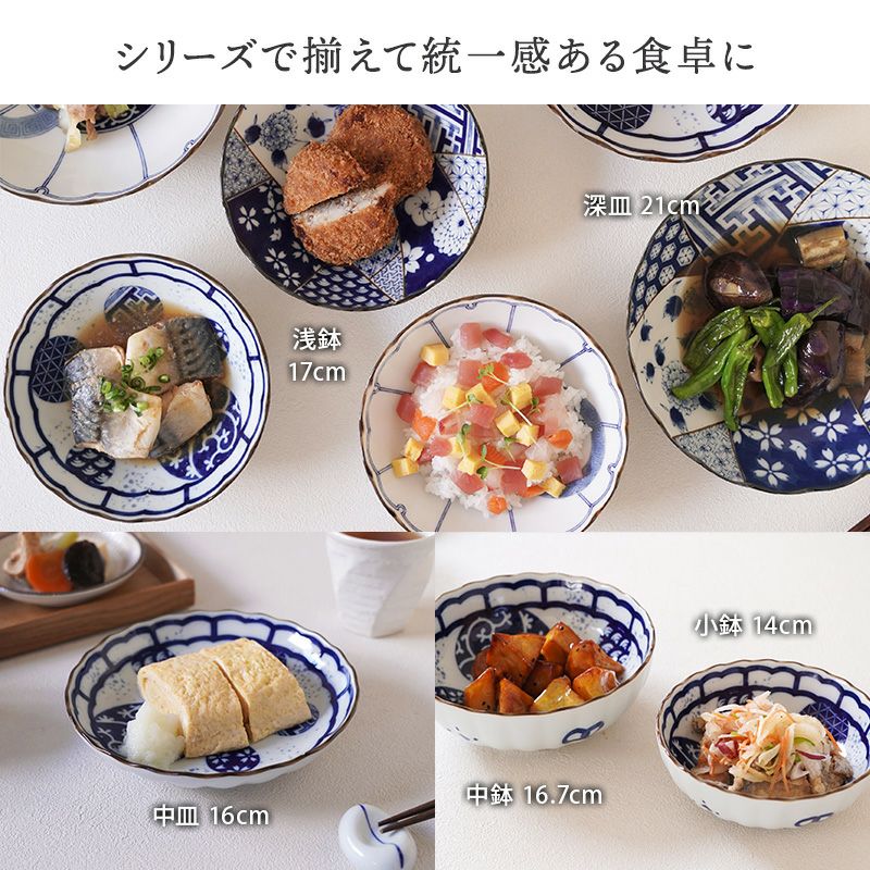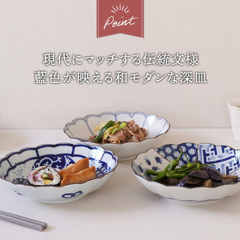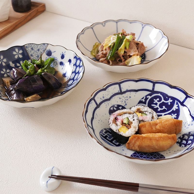菊の花を模した縁が美しい、21cmサイズの中皿。 ほどよい深さがあるため、煮魚やロールキャベツ、炒め物など汁気のある料理のほか、ヨーグルトやフルーツなどのデザート類にもぴったりです。 和食だけでなく中華のおかずにもよく合うデザインで、藍色の絵柄が落ち着きのある和モダンな食卓を演出します。 並べるだけで食卓がぐっと華やかに。普段使いにもおもてなしにも◎