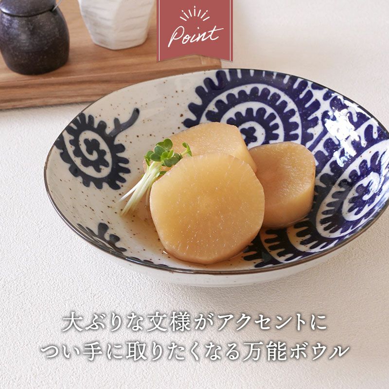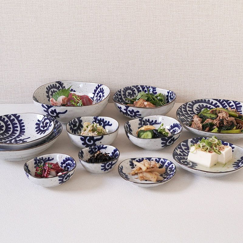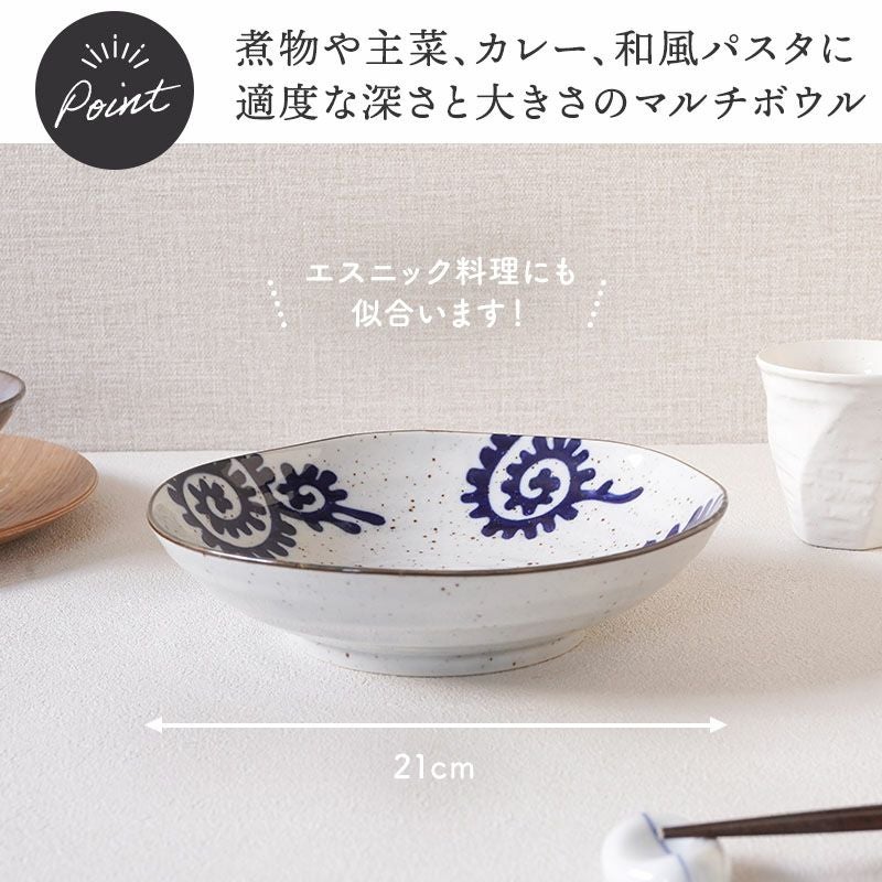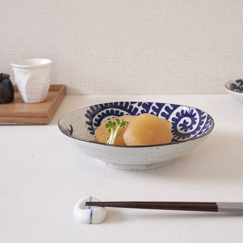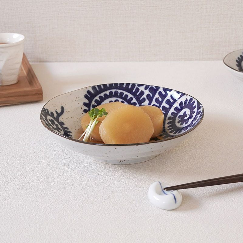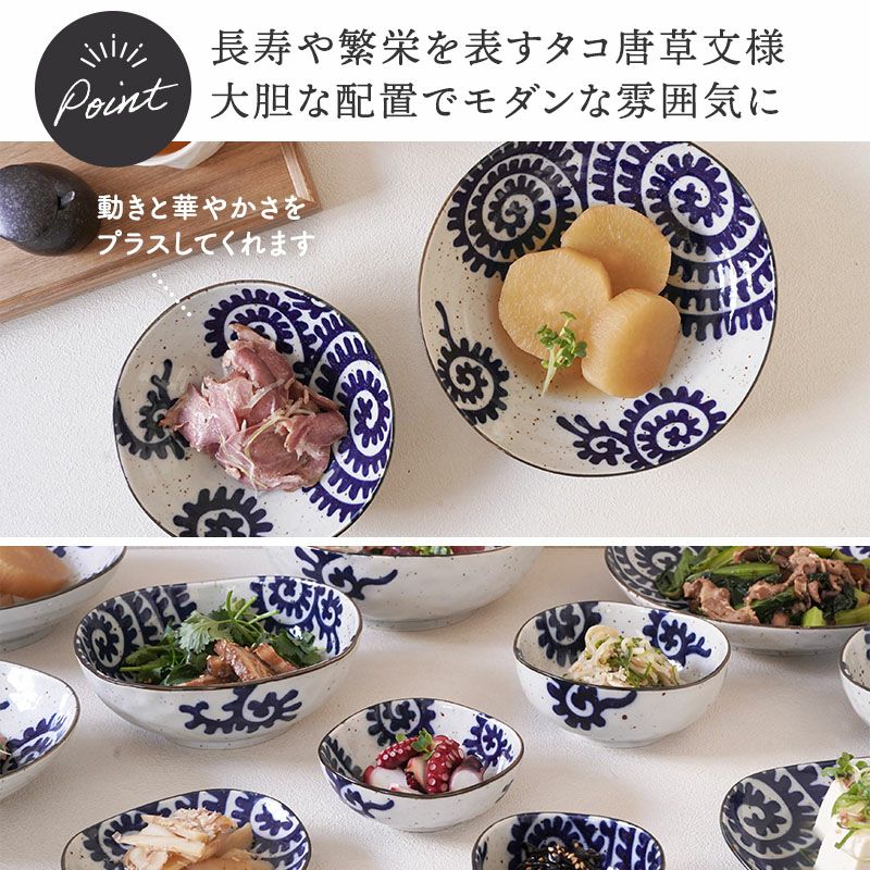 伝統柄「太タコ唐草」をあしらった、和モダンな21cmの深皿です。 煮物やサラダ、メイン料理にも使いやすい、程よいサイズの和食器。 藍色の美しい和柄が食卓をおしゃれに引き立てます。 和カフェ風の盛り付けや普段使いにもおすすめの食器です。