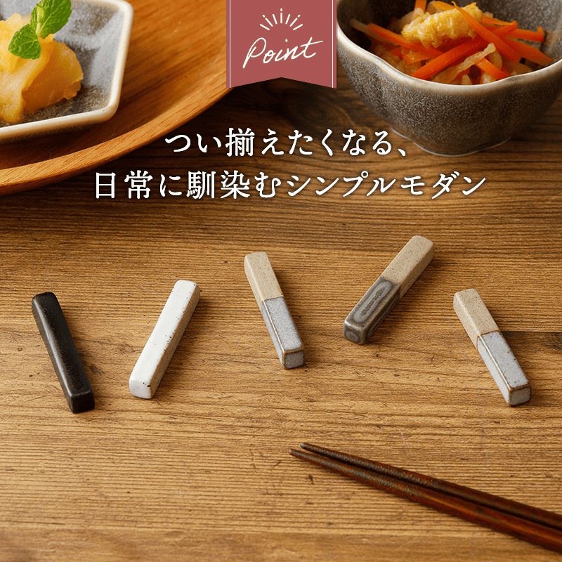 窯変の味わいが楽しめる箸置き。 シンプルな形が特徴的です。 細長い形ですので、箸以外にフォークやスプーンのカトラリーレストとしても使えます。 シックな色合いなので洋風の食卓にもしっくり馴染んでくれますよ。