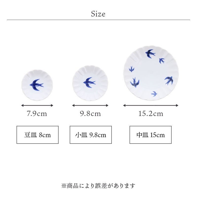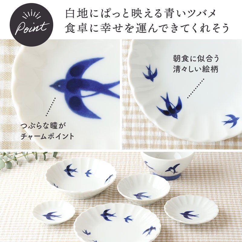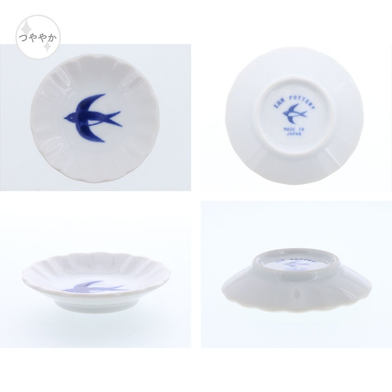 ブルーのツバメ柄が目を惹く豆皿です。 醤油皿、漬物皿、薬味皿、珍味皿などに大活躍してくれます。 常備菜やおかずをちょこっと盛り付けてもカフェ風で素敵です。 食器以外にもアクセサリートレイとしてもおすすめですよ♪