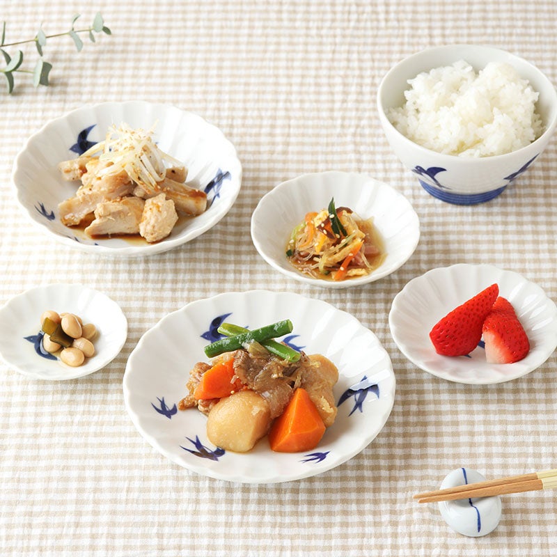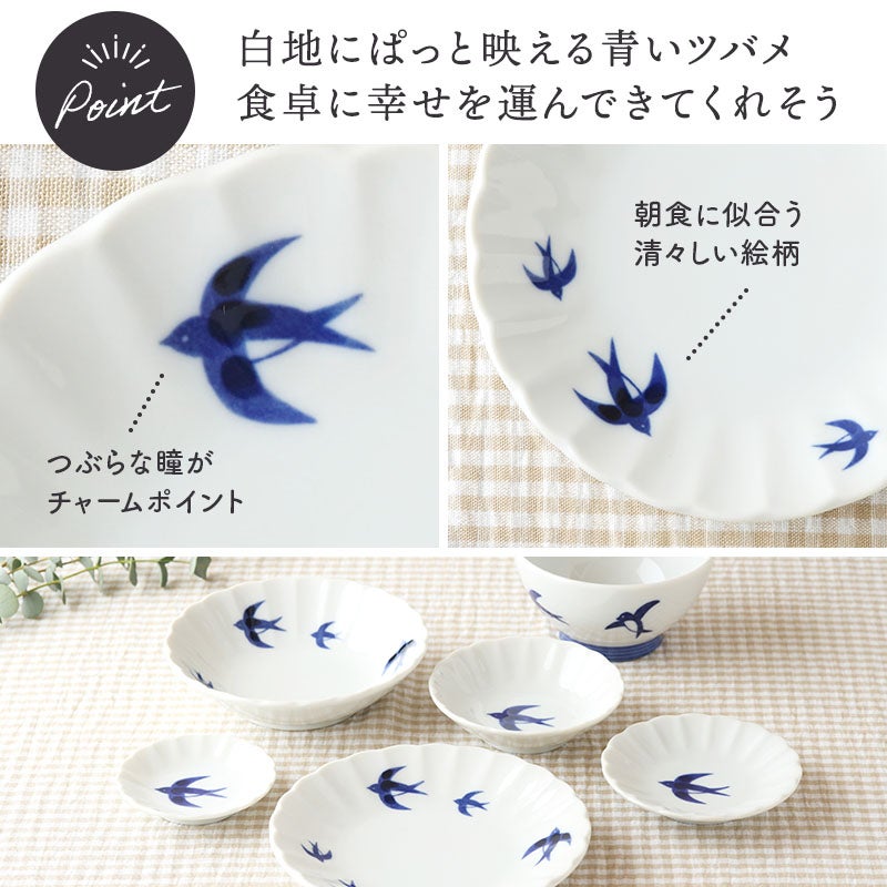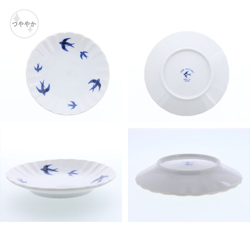 ブルーのツバメ柄が目を惹く中皿です。 取り皿や前菜皿、副菜皿として使えます。 他にもサラダ皿、パン皿、ケーキ皿などデザートプレートとしてもおすすめ。 シンプルで使いやすいので、日常使いにぴったりな器です。