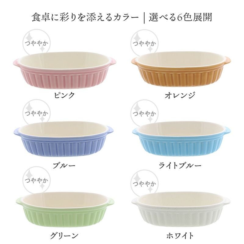 カラフルでつややかな色合いが魅力のグラタン皿。 約485ccの容量で、グラタンやドリアはもちろん、煮込みハンバーグなどの煮込み料理などにぴったり。 電子レンジ・オーブン・食洗機対応で、温め直しや調理もそのままでOK。 熱々のお料理を食卓に並べることができ、おもてなし料理にも活躍します。