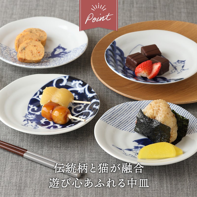 伝統柄と猫が融合した、遊び心あふれる中皿「SOMENEKO」シリーズ。 和の意匠にひょっこり現れる猫の姿が愛らしく、毎日の食卓を和ませてくれます。 直径16.4cmの中皿は、主菜や取り皿、ケーキやパンの盛り付けにもぴったり。 見て楽しく、使って癒される、日々の食卓にほっこりを添える一枚です。