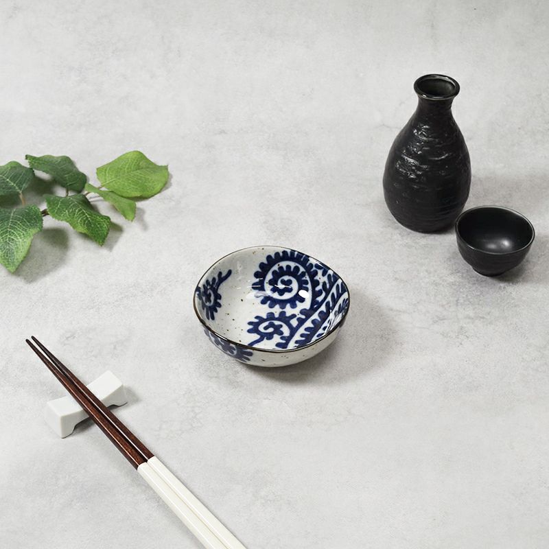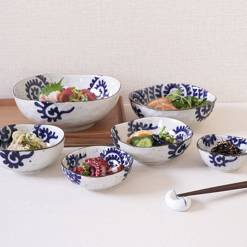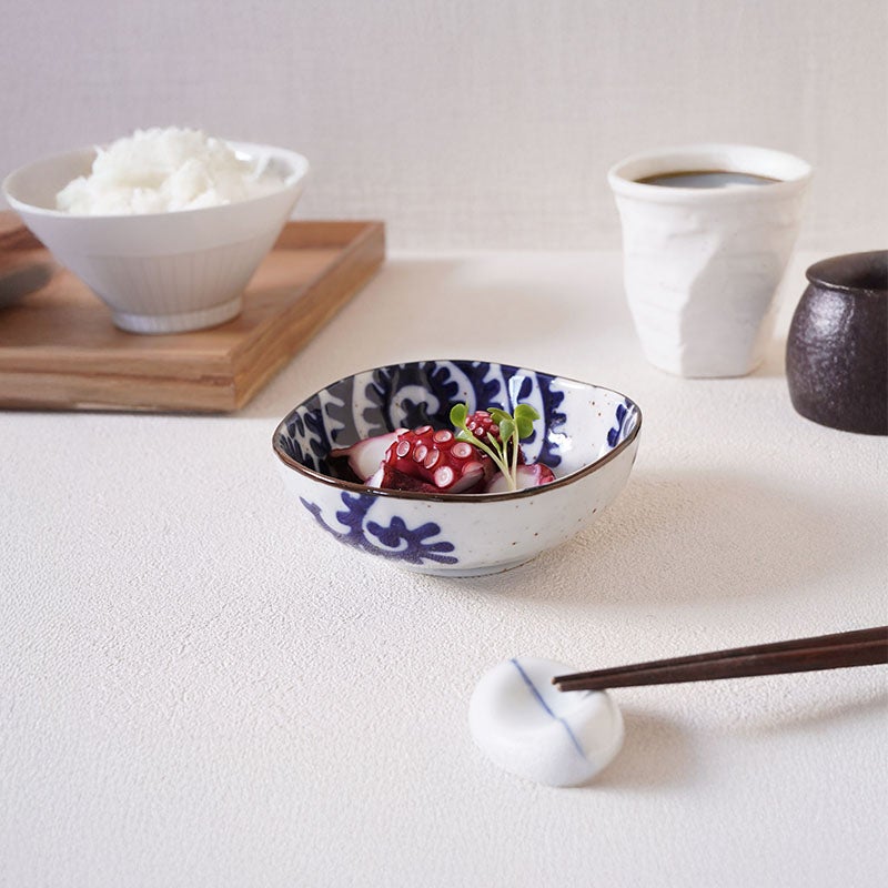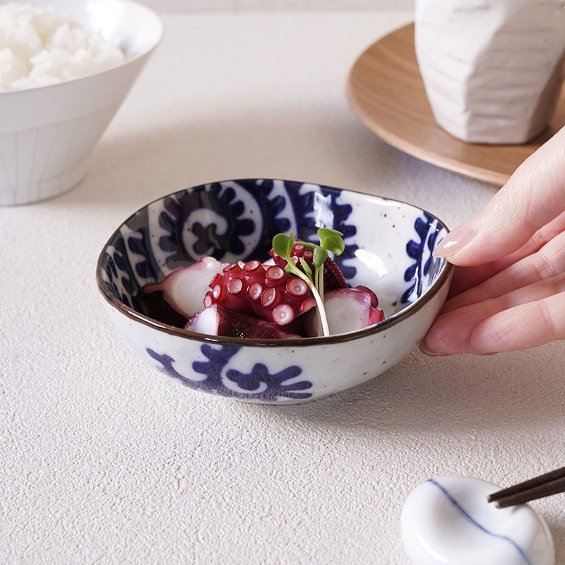 大胆な太めのタコ唐草模様が印象的な、和の趣ただよう小鉢。 11cmサイズは、副菜やお漬物、薬味など日々のお料理やおつまみに大活躍なサイズです。 丸でも四角でもない三角形が、食卓にリズムと変化を与えてくれます。 和食器好きにはたまらない、遊び心のある一品です。