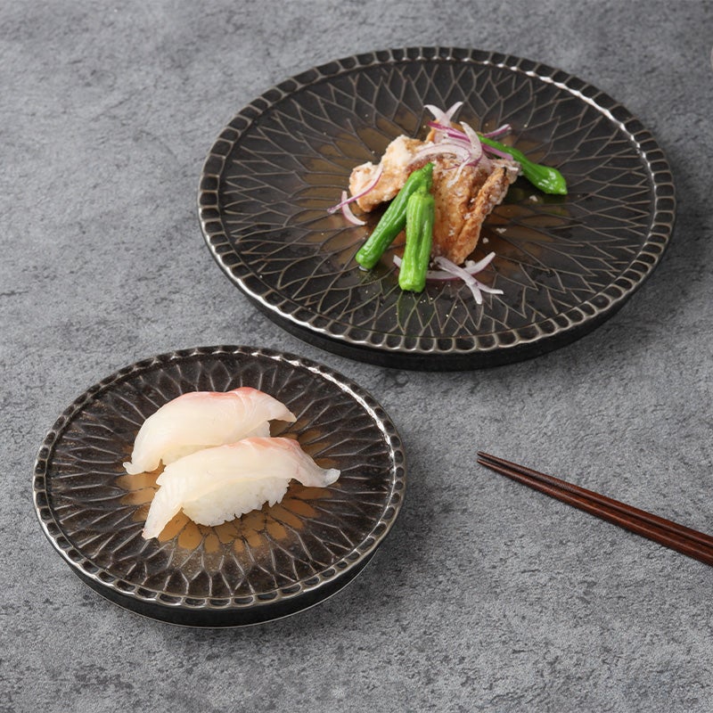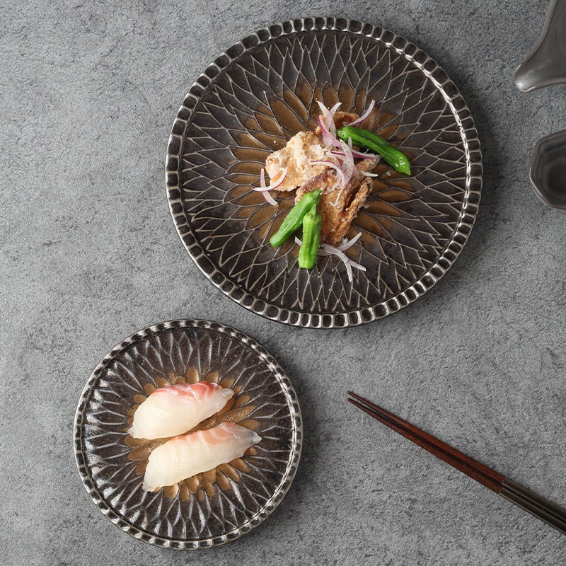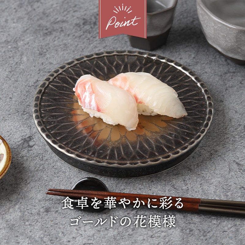 華やかなゴールドカラーが食卓を明るく彩る中皿サイズのプレート。 花びらのような繊細なデザインが料理をやさしく引き立てます。 前菜やデザートを盛り付けるのはもちろん取り皿としても活躍。 日常使いからおもてなしまで幅広くお使いいただけます。