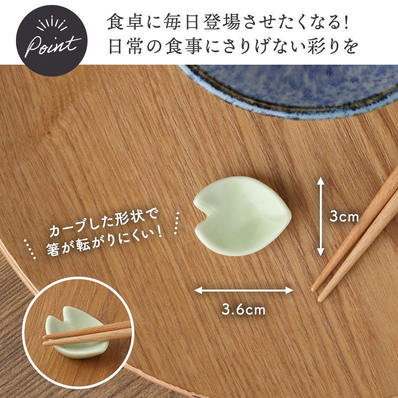 花型のかわいい箸置きです。 ちいさめなので邪魔にならず、収納にも助かります。 くるっとカーブした形状は、箸が転がり落ちることないため使い勝手も◎。 普段使いはもちろん、おもてなしの際にもステキに演出できますよ。