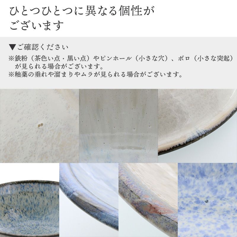 | 注意事項 | ※サイズは全て外寸になります。 ※サイズ・重さなどは商品により誤差があります。 ※鉄粉(茶色い点・黒い点)やピンホール(小さな穴)、ボロ(小さな突起)が見られる場合がございます。 ※釉薬の垂れや溜まりやムラが見られる場合がございます。 ※色飛びが見られる場合がございます。 ※色味・模様の出方に個体差が見られる場合がございます。 ※お客様のお使いのモニター設定、お部屋の照明等により実際の商品と色味が異なって見える場合がございます。 ※画像に含まれる小物は使用イメージのために使用しています。 ※不明な点がございましたら、お気軽にお問い合わせ下さい。 |