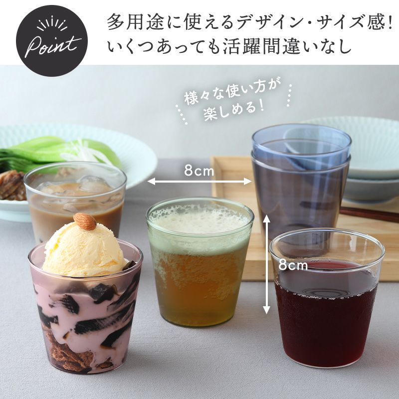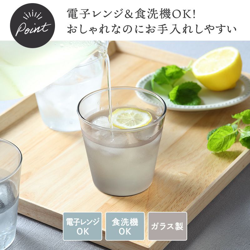 ガラスの透明感と、くすみカラーが絶妙なタンブラー。 耐熱ガラスだから、ホットもアイスも気軽に使えます。 270ccのちょうどいいサイズ感で、電子レンジ・食洗機も対応。 暮らしをやさしく彩る、毎日使いたくなる一品です。
