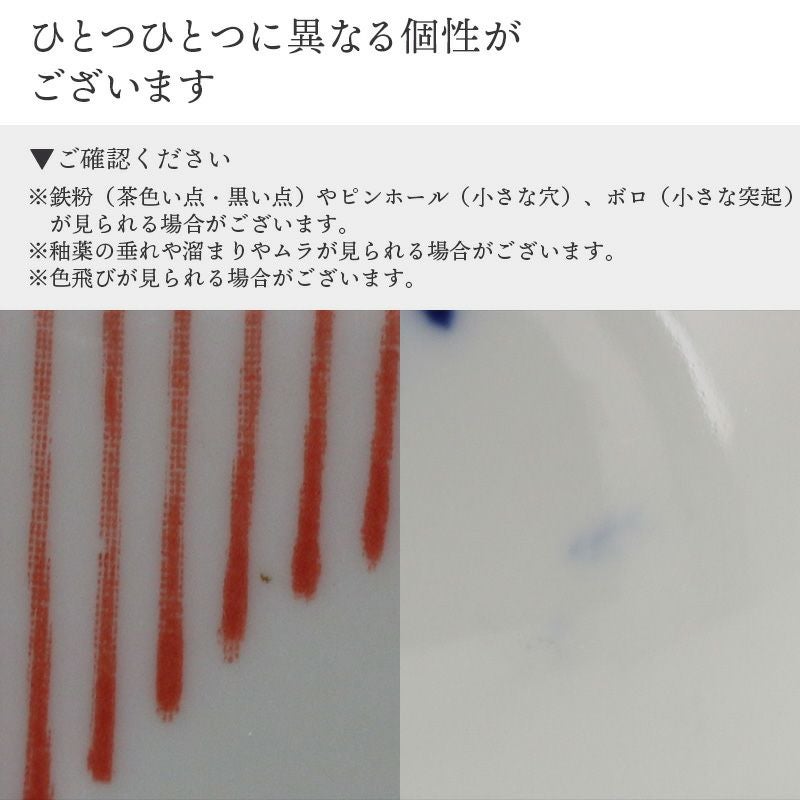 | 注意事項 | ※鉄粉(茶色い点・黒い点)やピンホール(小さな穴)、ボロ(小さな突起)が見られる場合がございます。 ※釉薬の垂れや溜まりやムラが見られる場合がございます。 ※色飛びが見られる場合がございます。 ※お客様のお使いのモニター設定、お部屋の照明等により実際の商品と色味が異なって見える場合がございます。 ※画像に含まれる小物は使用イメージのために使用しています。 ※不明な点がございましたら、お気軽にお問い合わせ下さい。 |