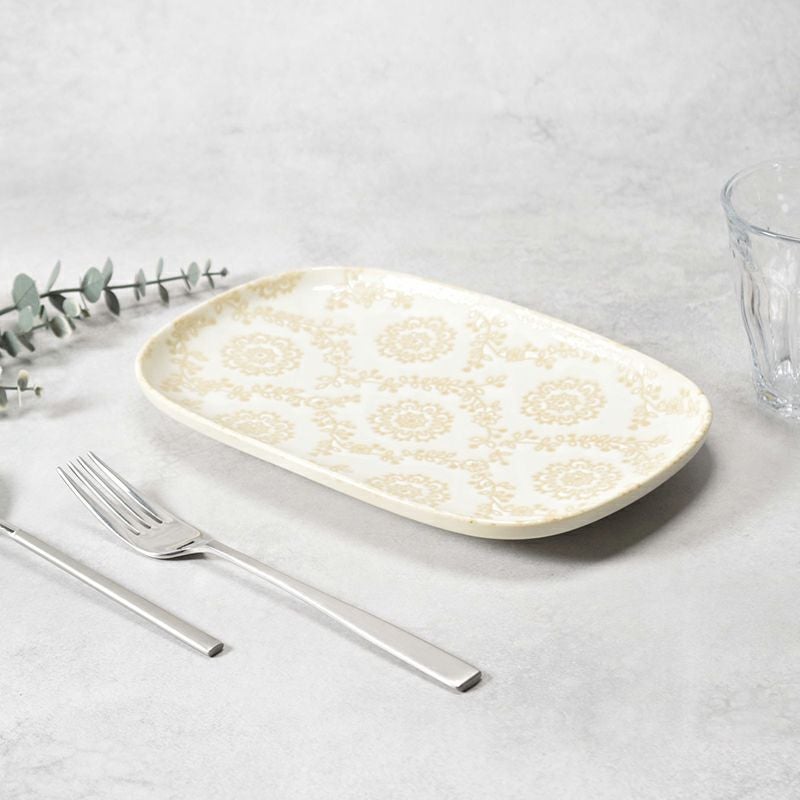 やわらかな長方形のフォルムに、繊細なレース柄をあしらった「ロイヤルレース」シリーズの24cm変形皿。