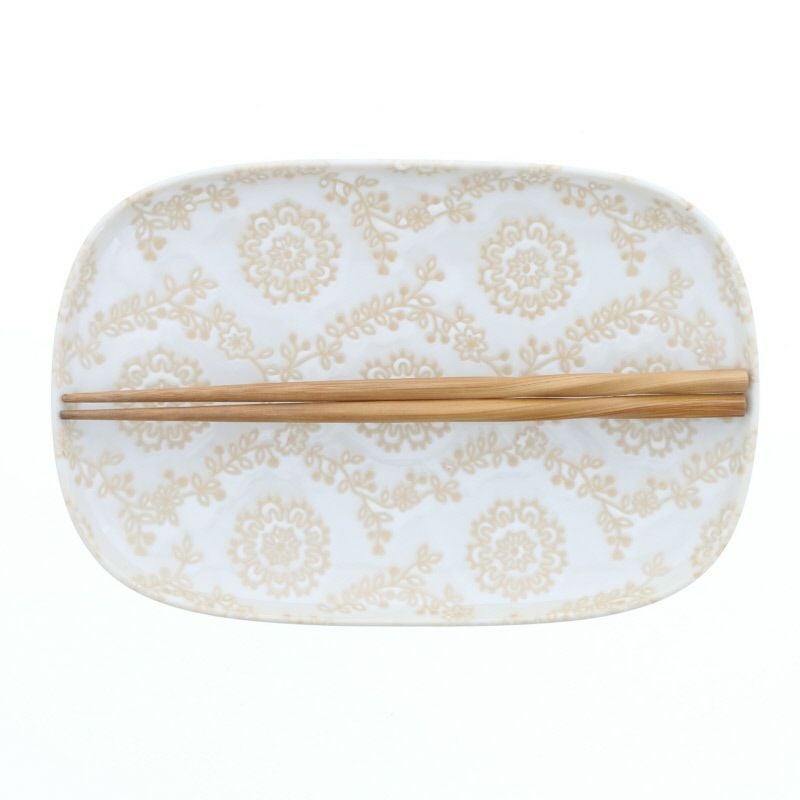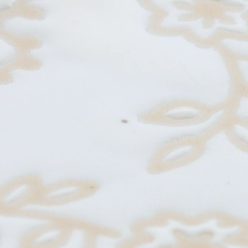 上品なアイボリー色に浮かぶ花模様が、料理をやさしく引き立てます。サラダや前菜はもちろん、デザートの盛り付けにもぴったり。