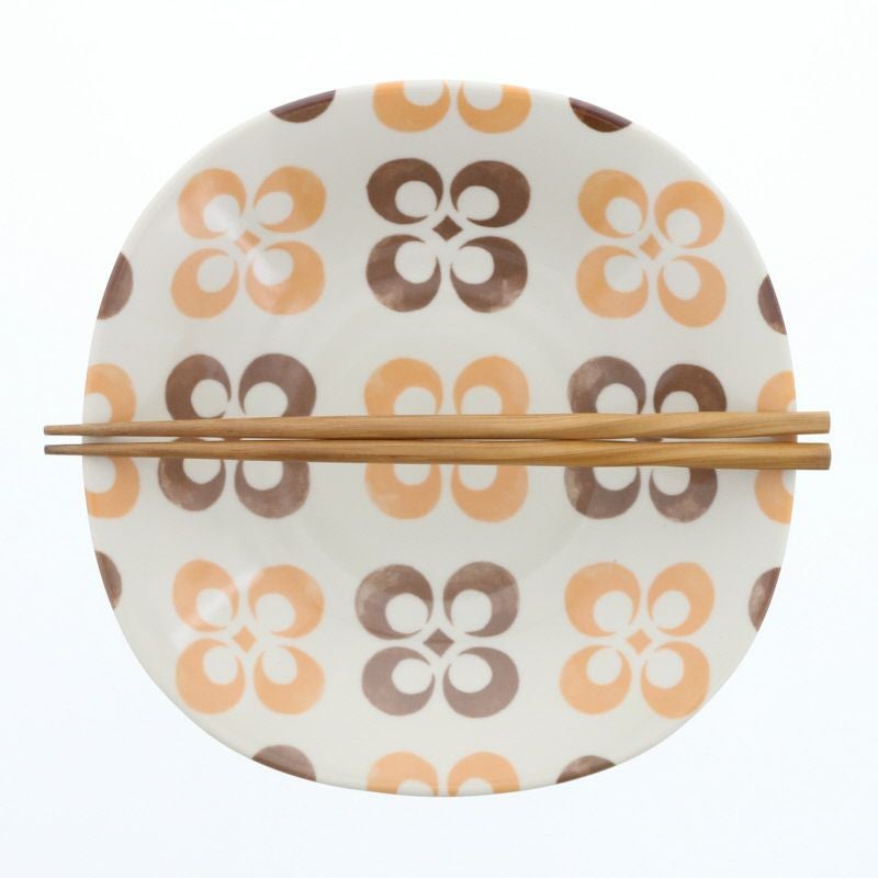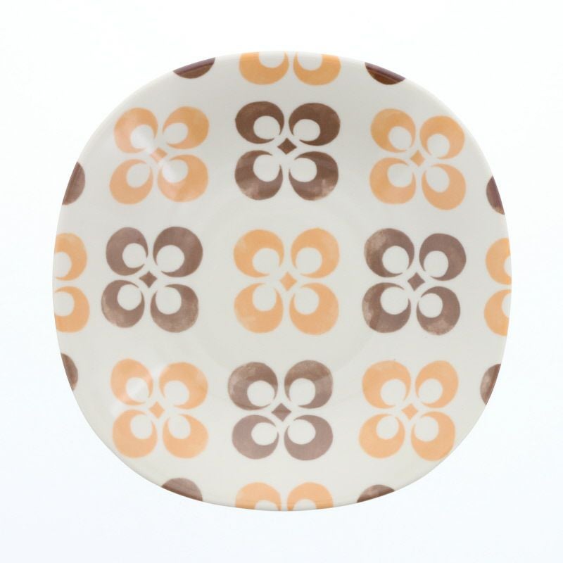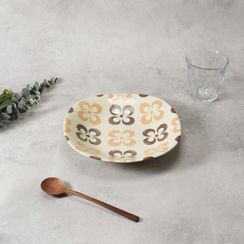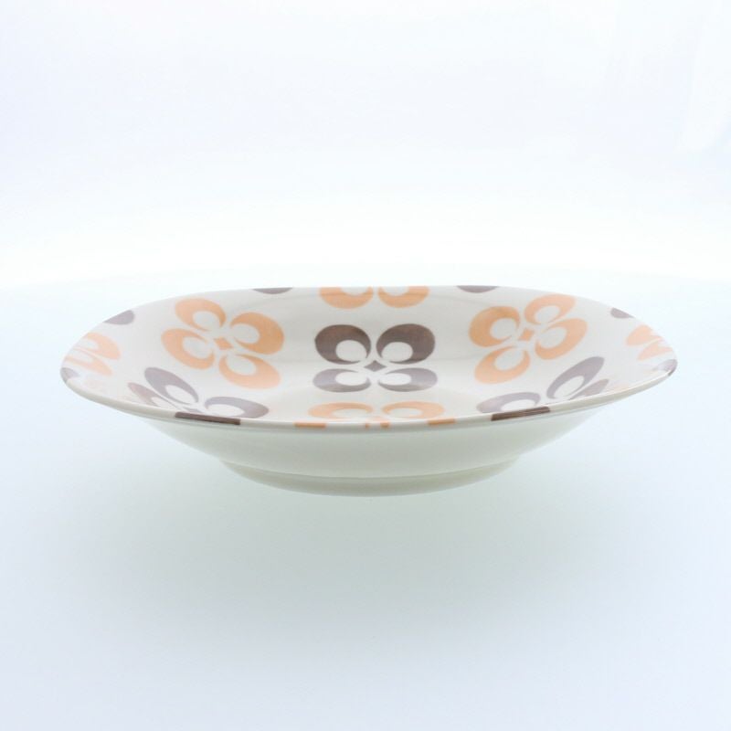 ベージュをベースに、オレンジとブラウンの花柄をあしらったレトロなデザインの深皿です。
