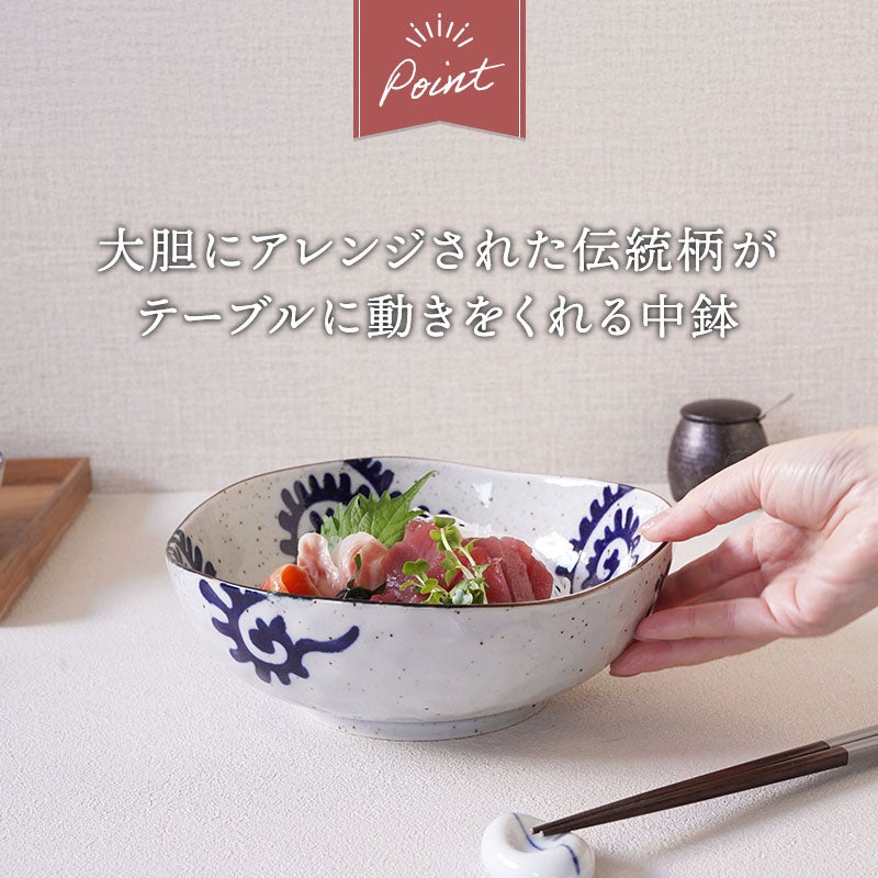 大胆な太唐草模様が施されたこちらの和食器は、食卓に和モダンな印象を与え、