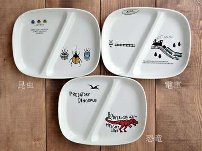 おしゃれなイラストで、お母さんお父さんも子供に使わせたくなる、こども用食器のブランド「TOTOY(トトーイ)」。 こちらの子供用食器のランチプレートは、仕切り皿の中でもシンプルで人気の形。 小さめでお子様にぴったりのサイズです。お子様ランチなど、子供が喜ぶこと間違いなしですよ。 また、複数のおかずなどを盛りつけれるため、使う食器の枚数も減り、後片付けも楽!朝昼晩使えてとっても便利な子供食器です。 白い素地に映えるイラストは「昆虫」「恐竜」「電車」の3種類です。