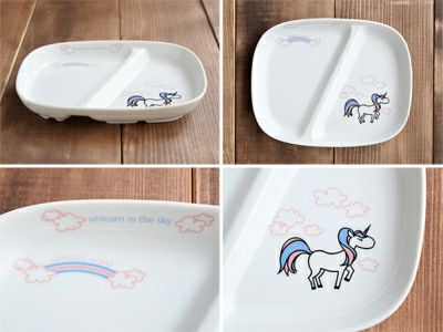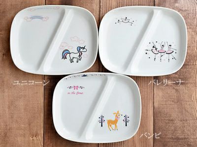 おしゃれなイラストで、お母さんお父さんも子供に使わせたくなる、こども用食器のブランド「TOTOY(トトーイ)」。 こちらの子供用食器のランチプレートは、仕切り皿の中でもシンプルで人気の形。 小さめでお子様にぴったりのサイズです。お子様ランチなど、子供が喜ぶこと間違いなしですよ。 また、複数のおかずなどを盛りつけれるため、使う食器の枚数も減り、後片付けも楽!朝昼晩使えてとっても便利な子供食器です。 白い素地に映えるイラストは「ユニコーン」「バンビ」「バレリーナ」の3種類です。