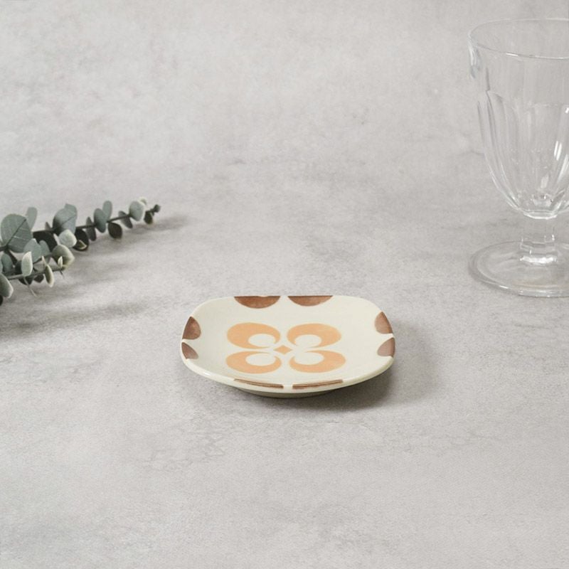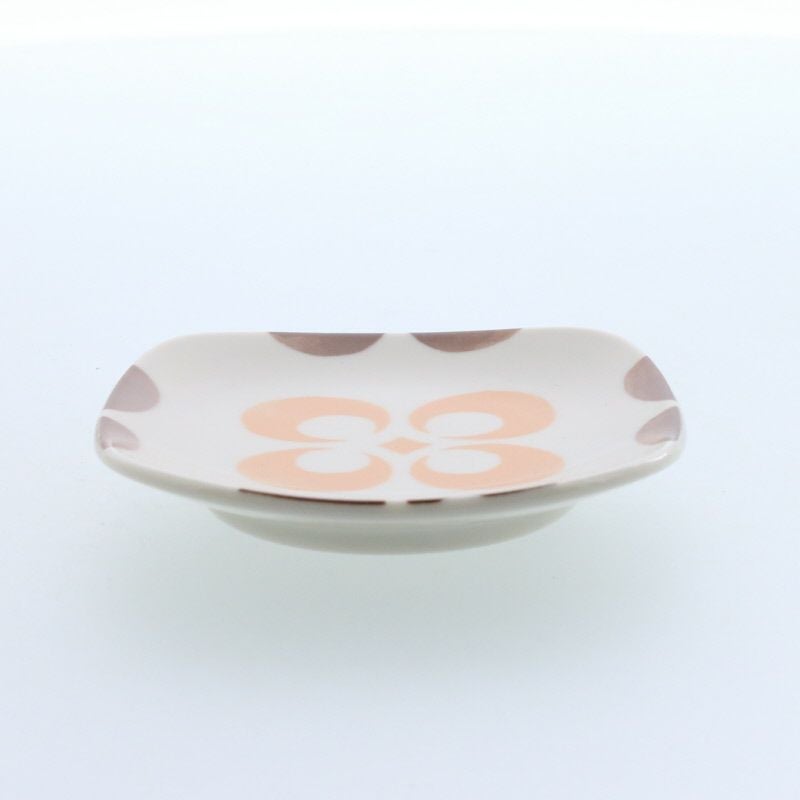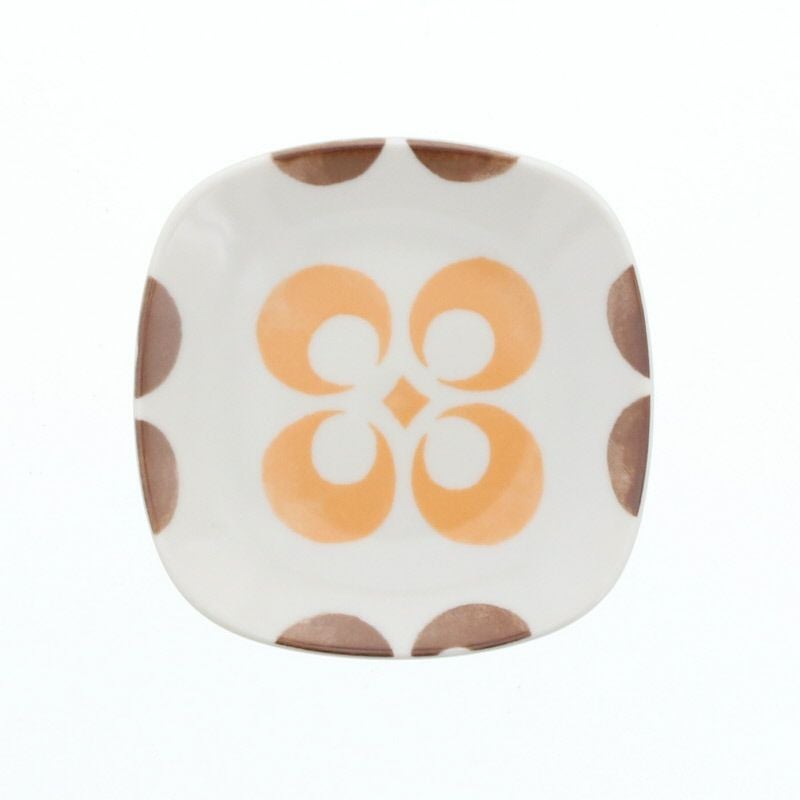 ベージュをベースに、オレンジとブラウンの花柄をあしらったレトロなデザインのプレートです。