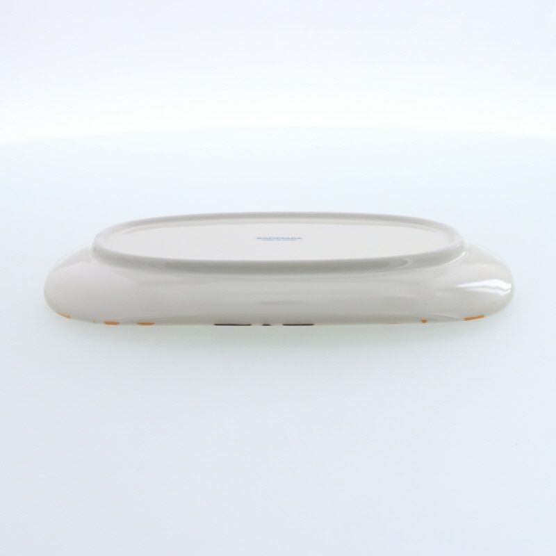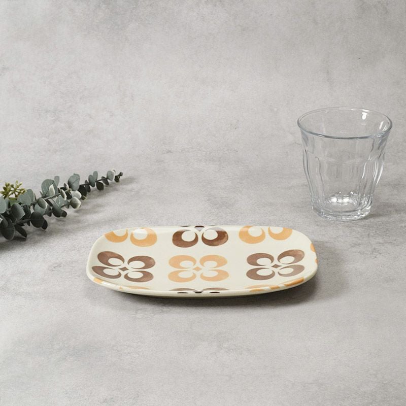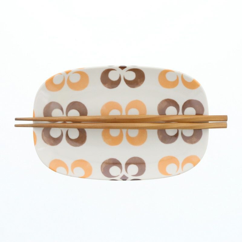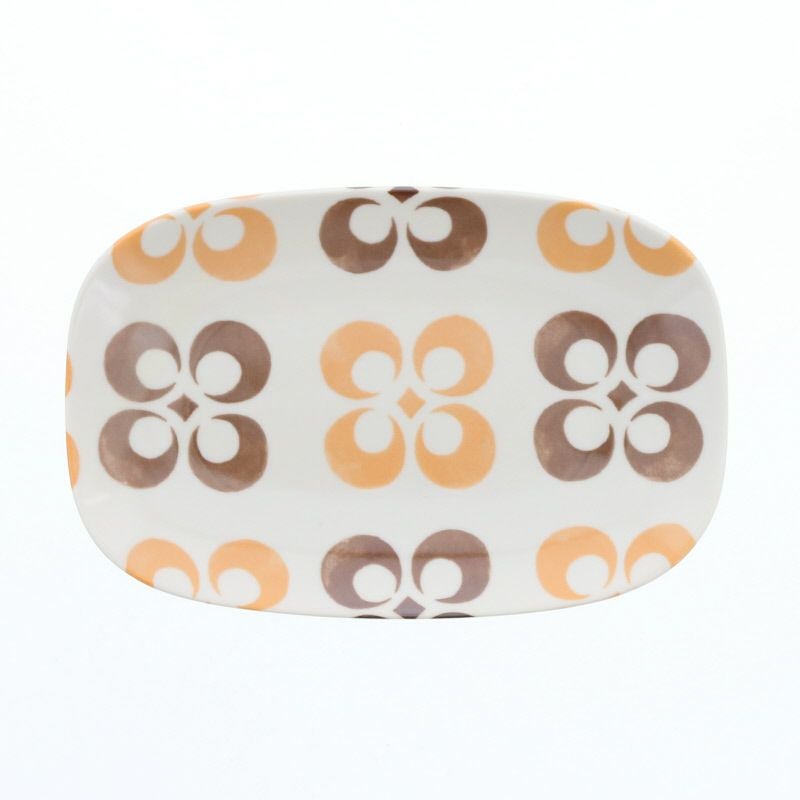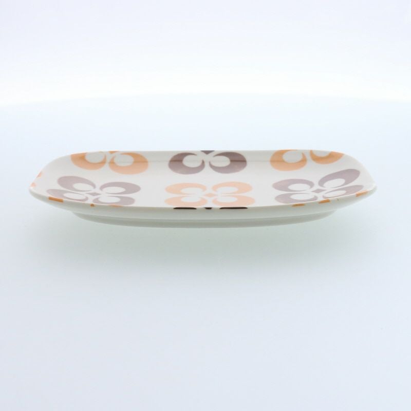 ベージュをベースに、オレンジとブラウンの花柄をあしらったレトロなデザインの長皿です。