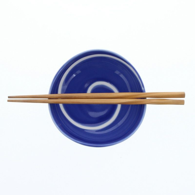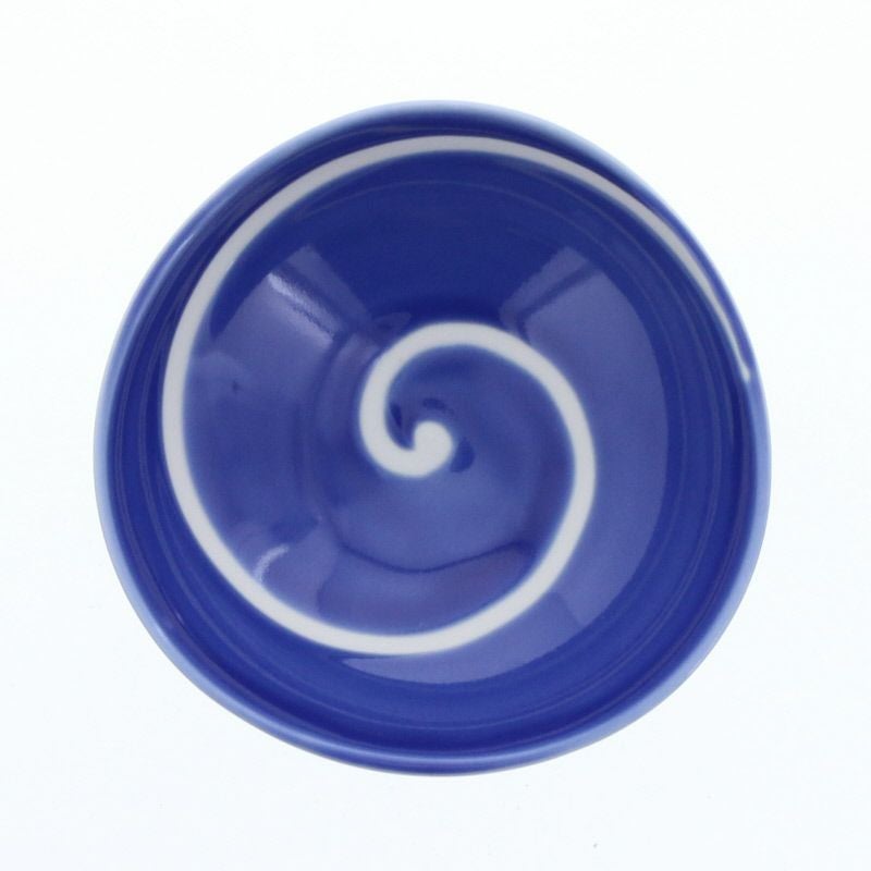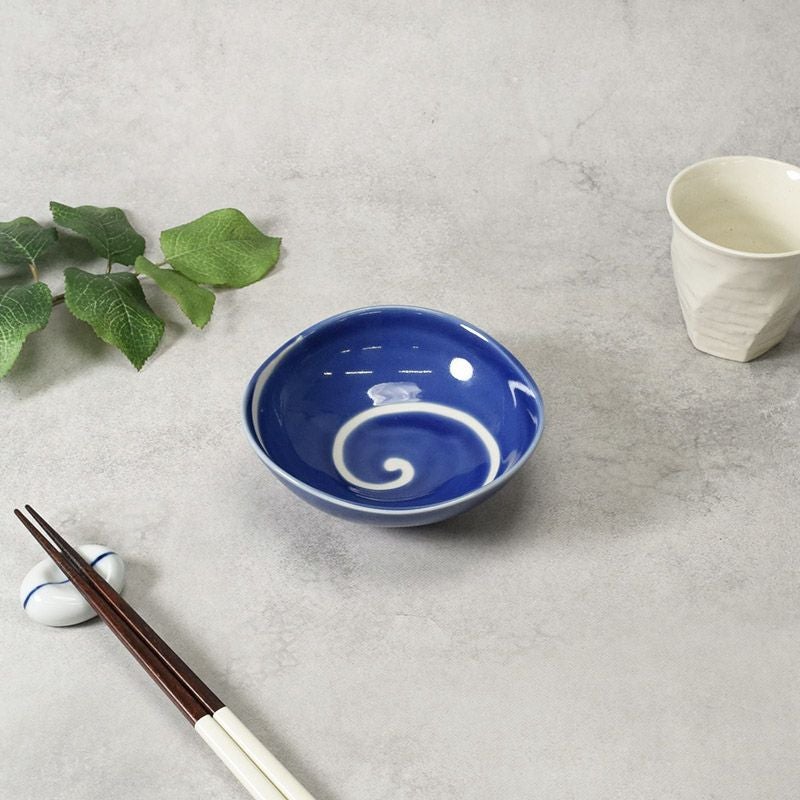 鮮やかな青に白い渦が描かれた、動きのあるデザインが印象的な小鉢です。