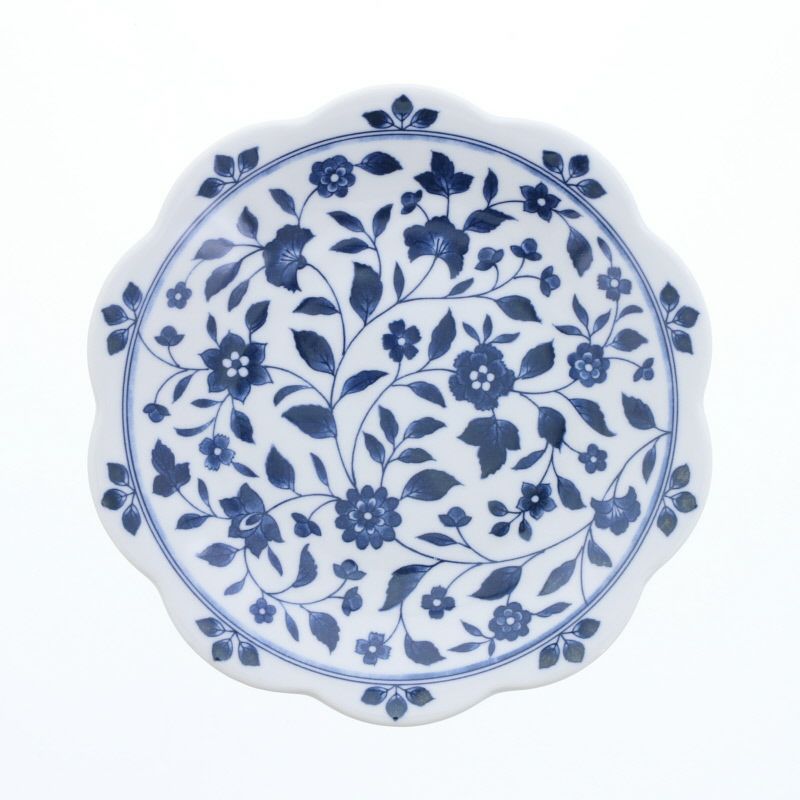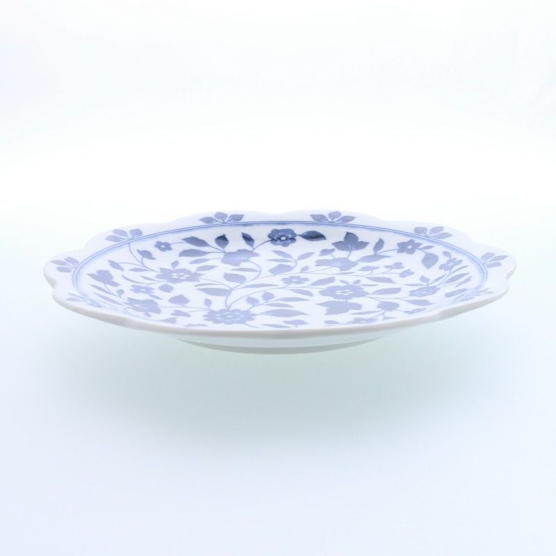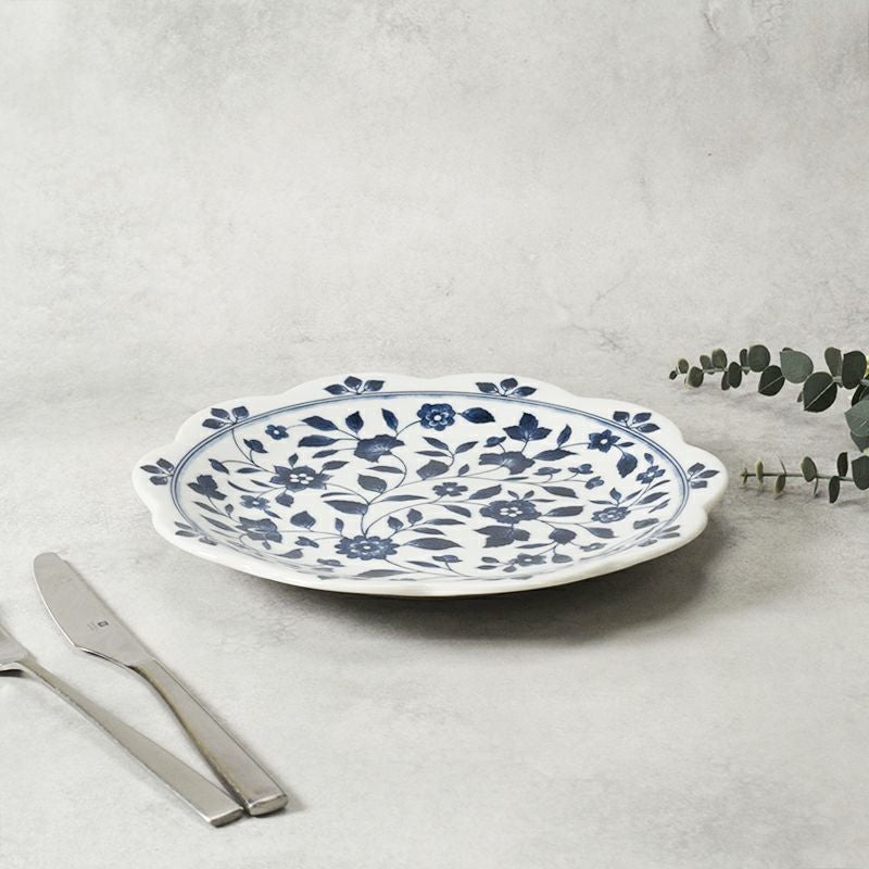 白地に濃い青で描かれた花模様、華やかさと落ち着きを兼ね備えた大皿です。