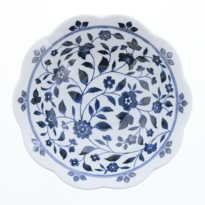 白地に清らかな青の「洛悠花」模様をあしらった、華やかさと落ち着きを兼ね備えた浅鉢です。