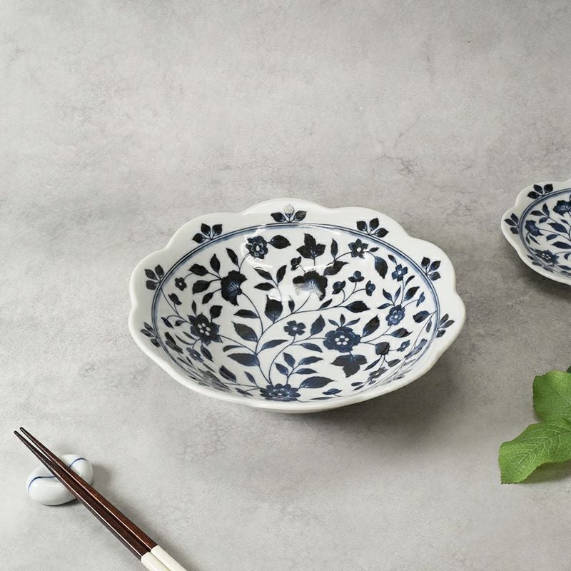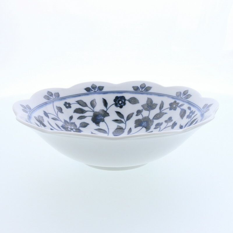 白地に濃い青で描かれた花模様が、食卓に静かな華やかさを添える大鉢です。