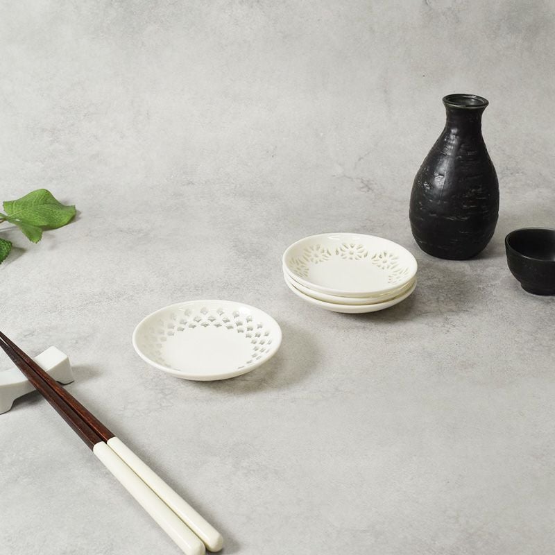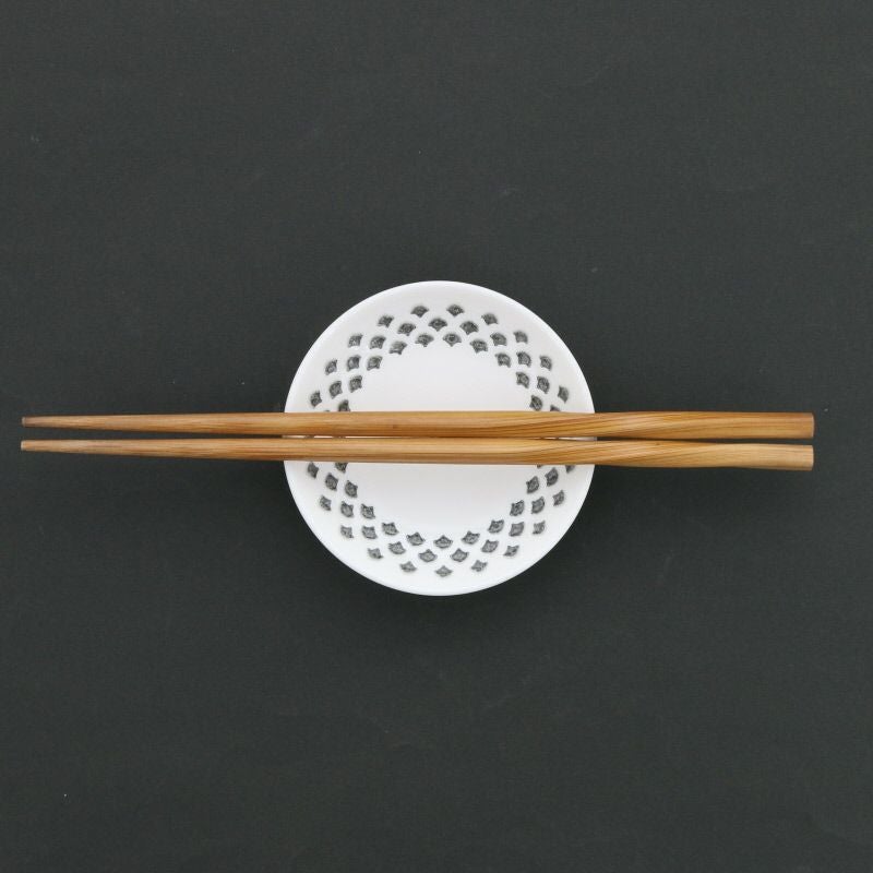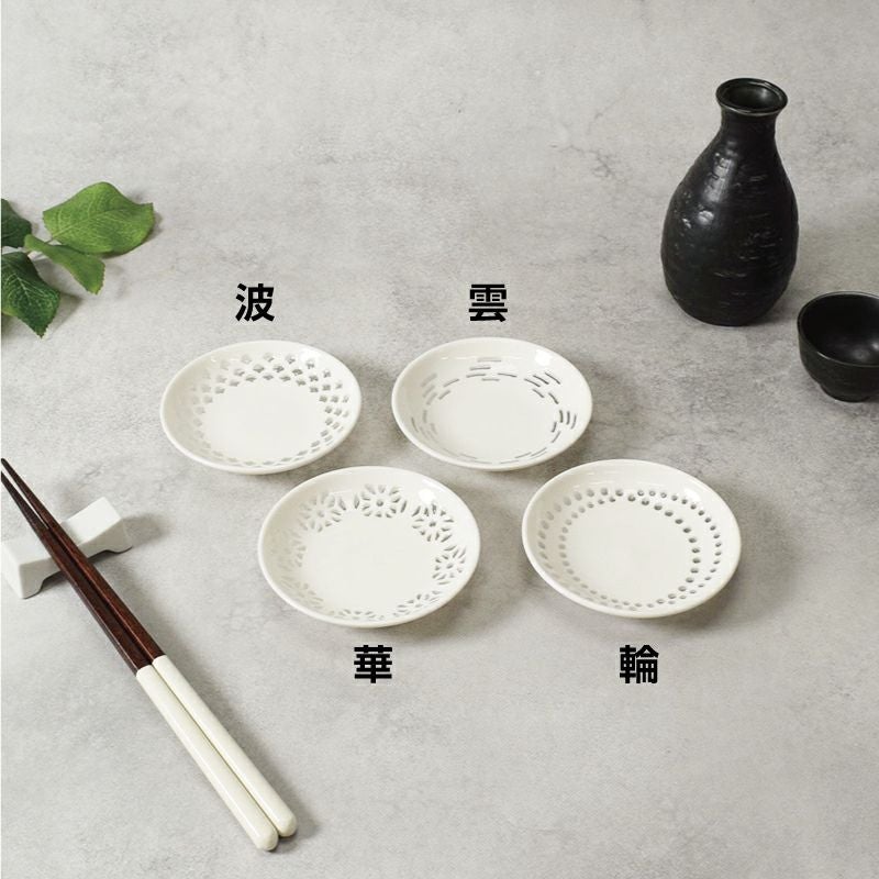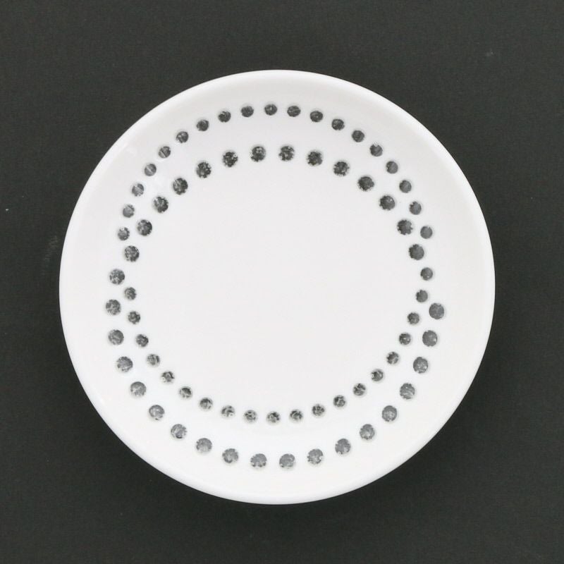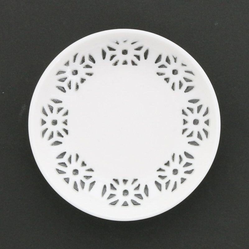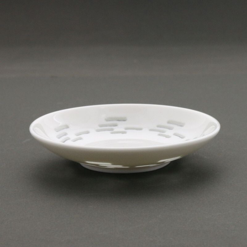 やわらかな白い器に、和のデザインがさりげなく映える小皿です。