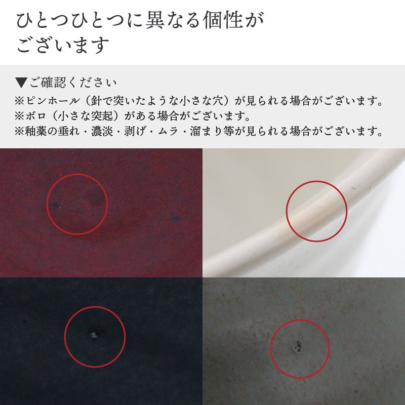 | 注意事項 | ※小さな傷が見られる場合があります。 ※ピンホール(針で突いたような小さな穴)が見られる場合がございます。 ※ボロがある場合がございます。 ※鉄粉(茶色い点・黒い点)が見られます。 ※釉薬の垂れ・濃淡・剥げ・ムラ・溜まり等が見られる場合がございます。 ※入荷毎に色味・質感が異なる場合がございます。 ※窯変(ようへん)の色は、焼成毎に色味が異なる商品です。 ※お客様のお使いのモニター設定、お部屋の照明等により実際の商品と色味が異なって見える場合がございます。 ※画像に含まれる小物は使用イメージのために使用しています。 ※不明な点がございましたら、お気軽にお問い合わせ下さい。 |