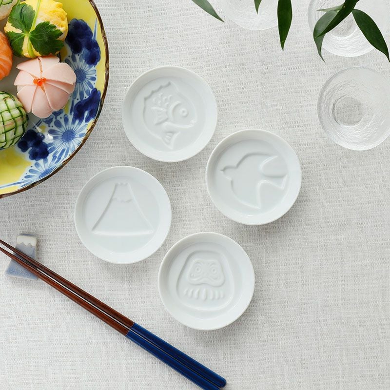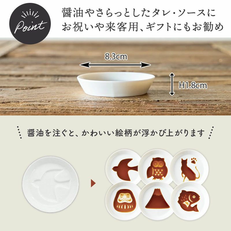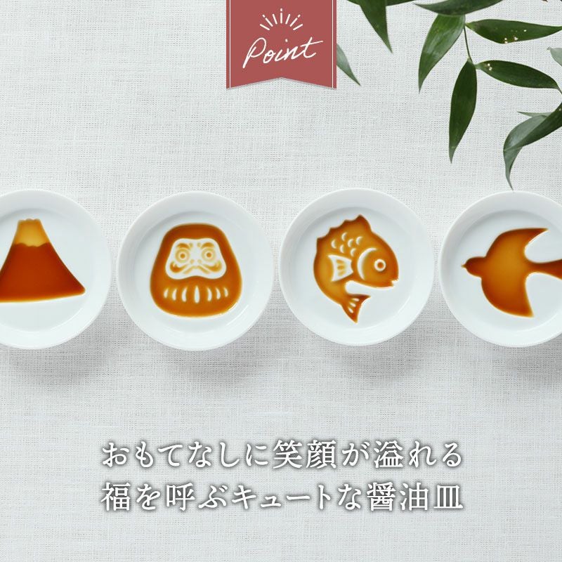 白いお皿にしょうゆを注ぐとキュートで縁起の良い絵柄が浮かびあがります。