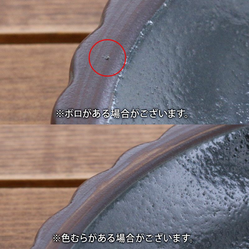 | 注意事項 | ※サイズは全て外寸になります。 ご注意 ※色むらがある場合がございます。 ※ピンホール(針で突いたような小さな穴)が見られる場合がございます。 ※ボロがある場合がございます。 ※鉄粉(茶色い点・黒い点)が見られます。 ※釉薬の垂れや溜まりが見られる場合がございます。 ※お客様のお使いのモニター設定、お部屋の照明等により実際の商品と色味が異なって見える場合がございます。 ※画像に含まれる小物は使用イメージのために使用しています。 ※不明な点がございましたら、お気軽にお問い合わせ下さい。 |
