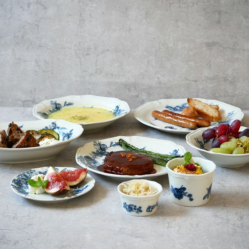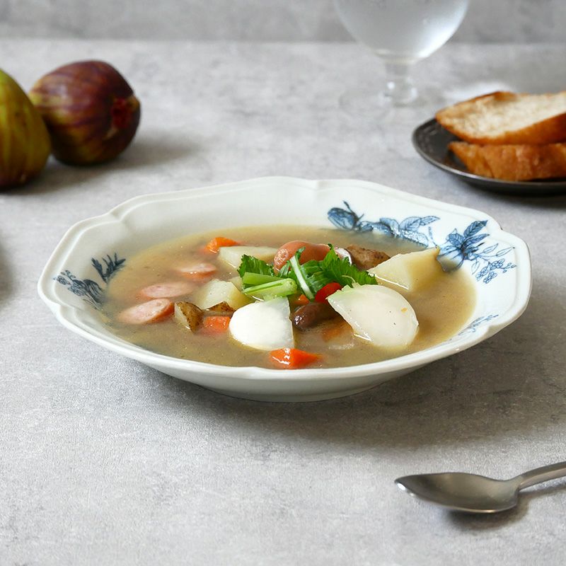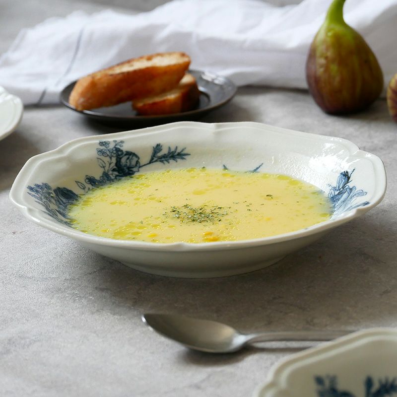 エレガントなアンティーク風スープ皿。 落ち着いたブルーの花柄が上品な食卓を演出してくれます。 スープ以外にもサラダボウル、パスタボウル、シリアルボウルなど多用途にお使いいただけます。 おもてなし食器としても最適です。