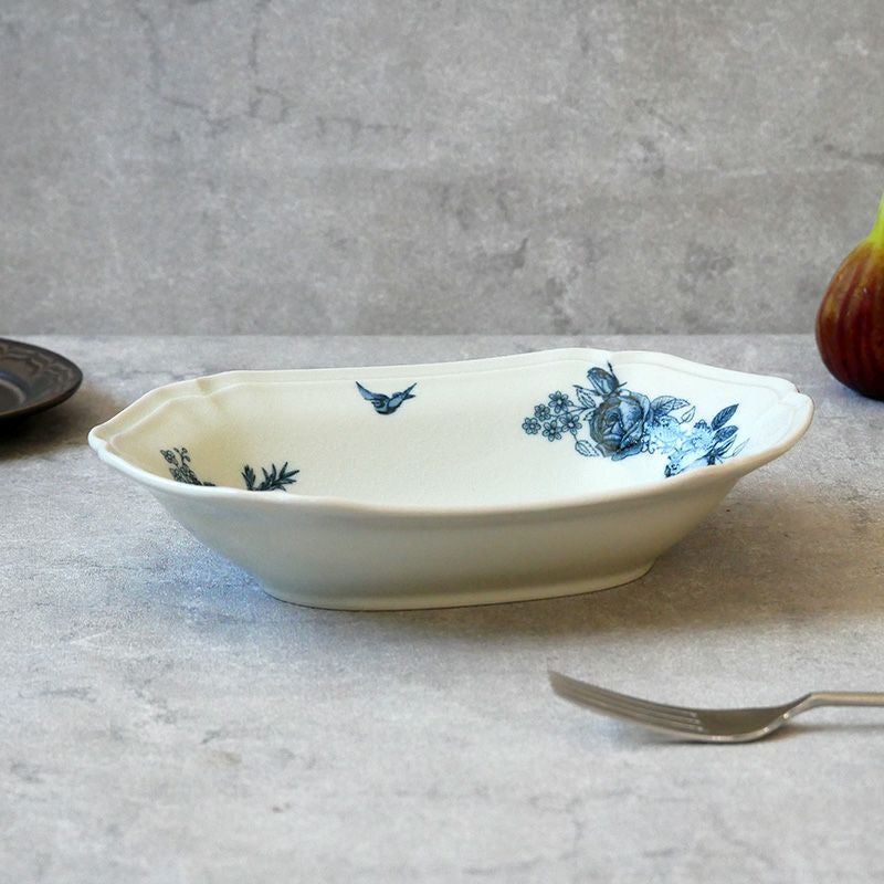 エレガントなアンティーク風オーバルボウル。 落ち着いたブルーの花柄が上品な食卓を演出してくれます。 カレーボウルやパスタボウル、シチュー皿、オムライスなどのメイン料理におすすめ。 おもてなし食器としても最適です。