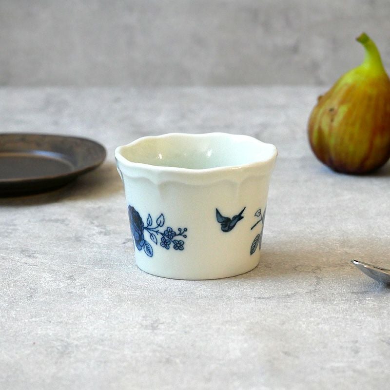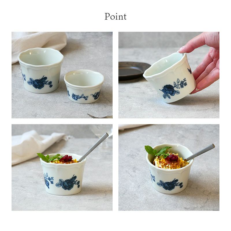 エレガントなアンティーク風カップ。 落ち着いたブルーの花柄が上品な食卓を演出してくれます。 デザートカップやちょっとしたおかずの小鉢、サラダカップ、ヨーグルトボウル、アイスカップなどに。 おもてなし食器としても最適です。