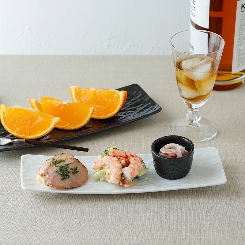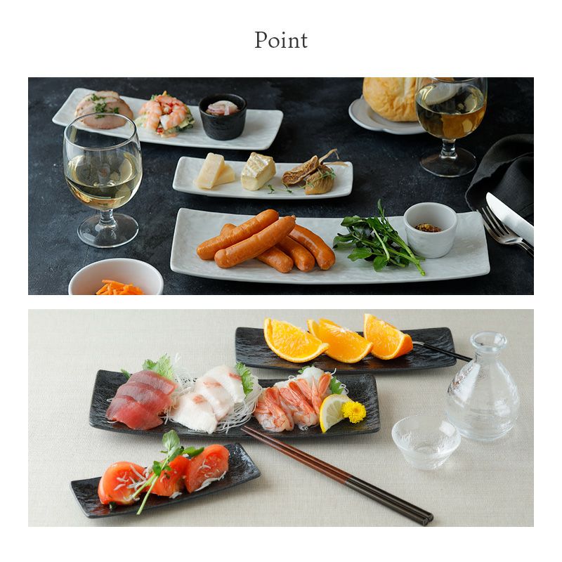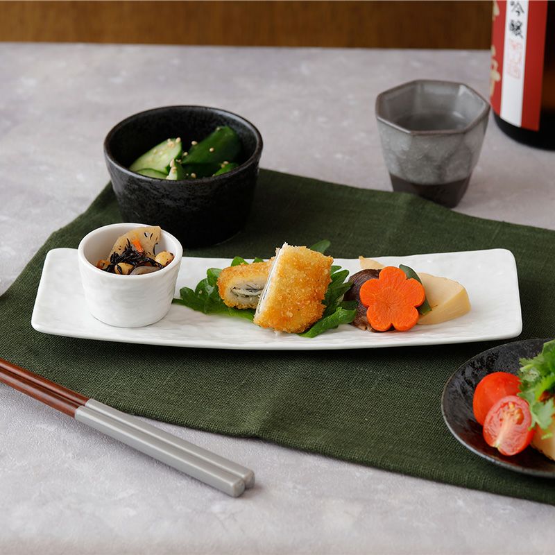 シンプルな長角皿は、使い勝手が抜群。 他の和食器や、洋食器にも合わせやすいのが嬉しいポイントです。 ちょっとしたおつまみやキムチ、ナムルの盛り合わせにもバッチリ。 食卓でもデッドスペースになりにくい、スマートなうつわです。
