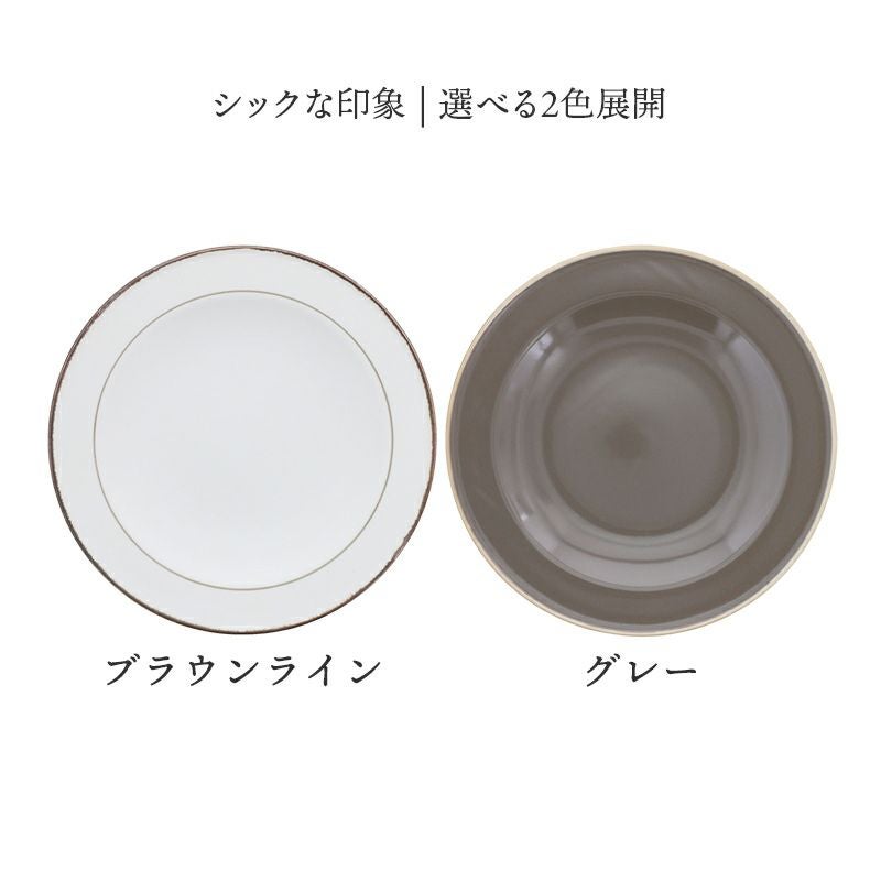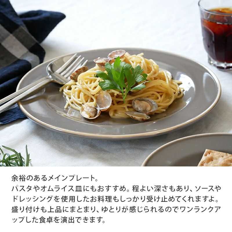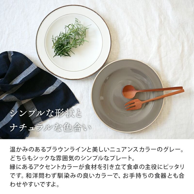 シックな雰囲気のシンプルなプレート。洋食、和食など料理を選ばず、縁にあるアクセントカラーが食材を引き立てます。 適度な立ち上がりがあるので、ドレッシングやソースなど多少の汁気にも対応してくれるのも、うれしいポイント。 こちらは大皿サイズで主菜皿、パスタ皿、デザート皿、サラダ皿などに最適。 上品なデザインのプレートなので、おもてなし食器としてもおすすめです。