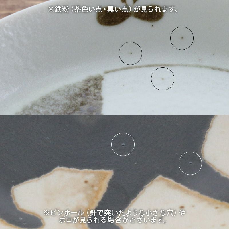 | 注意事項 | ※色むらがある場合がございます。 ※鉄粉(茶色い点・黒い点)が見られます。 ※釉薬の垂れや溜まりが見られる場合がございます。 ※ピンホール(針で突いたような小さな穴)やボロが見られる場合がございます。 ※お客様のお使いのモニター設定、お部屋の照明等により実際の商品と色味が異なって見える場合がございます。 ※画像に含まれる小物は使用イメージのために使用しています。 ※不明な点がございましたら、お気軽にお問い合わせ下さい。 |