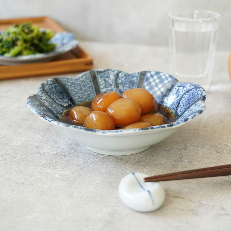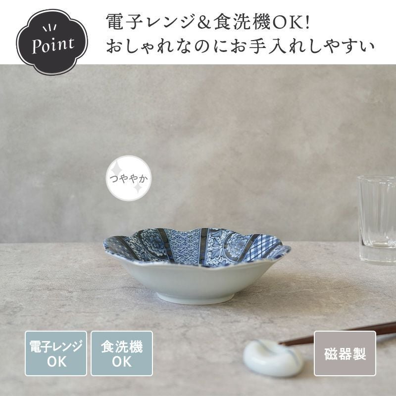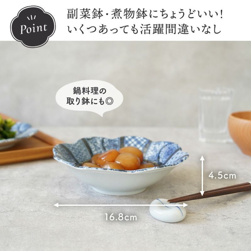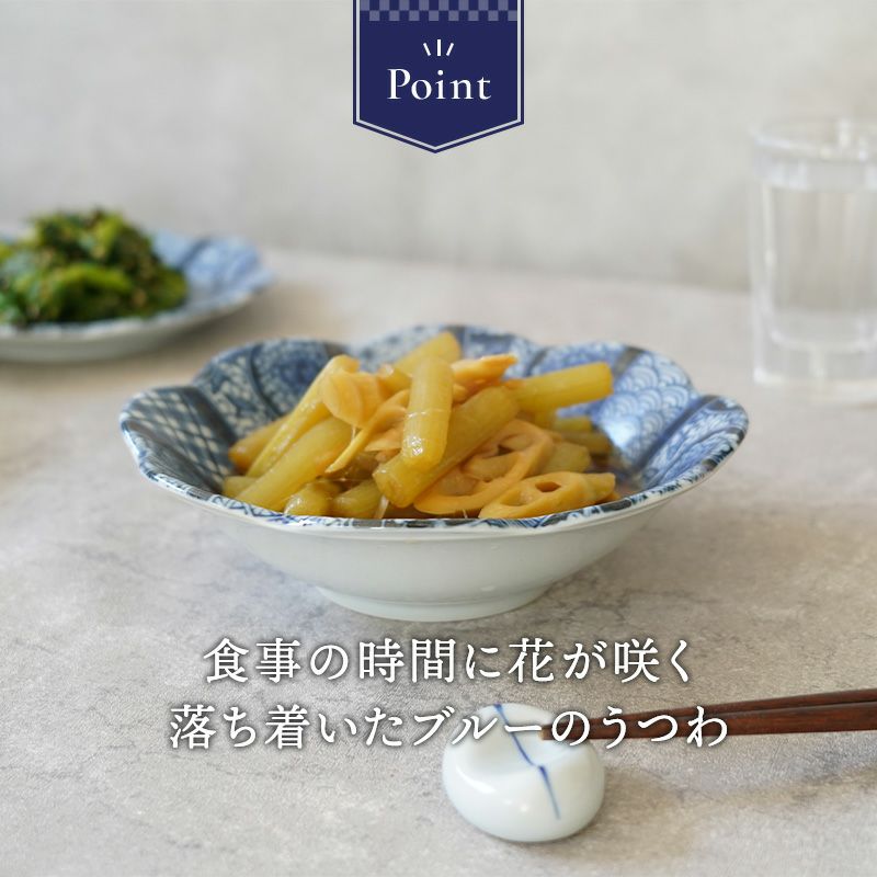 食卓を爽やかに彩るブルーの花型浅鉢です。 中鉢はサラダボウルや、おかずの盛り鉢・煮物鉢にオススメ。 その他シチューボウルや、シリアルボウルなどにも使えます。揃えておくと、朝昼晩どんなシーンでも活躍しますよ。 日本の伝統美が息づく、紺と白の和柄中鉢。趣のある食卓を演出します。