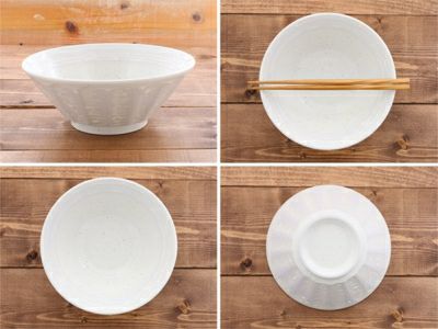 外側をストライプ状に削った「しのぎ」という技法を用いた、「しのぎ刷毛目」シリーズの6.3寸ラーメンどんぶりです。 こちらのラーメン鉢は、麺は1玉の大きさ。ご家庭で使いやすいサイズ。 うどん丼ぶりや、おそばのどんぶりなどにも併用出来るサイズとなっています。 温かみのある粉引は和食器の中でも人気。どんなメニューにも合わせやすい色合いです。 スッキリした台形型のフォルムは盛り付けがおしゃれにできるため好評です。